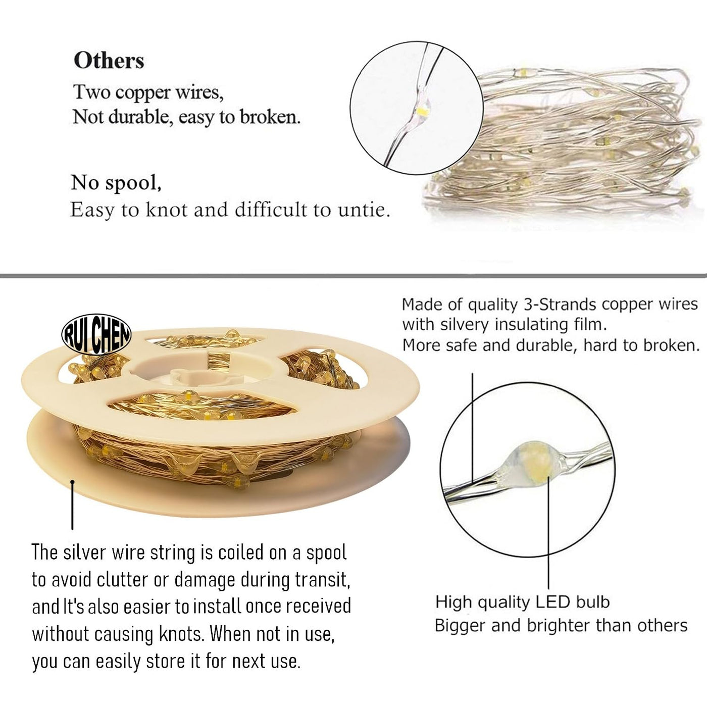 Q: How long is the RUICHEN Silver Wire Fairy Lights?A: The RUICHEN Silver Wire Fairy Lights measure 99 feet (30 meters) in length, providing ample coverage for your decorating needs.