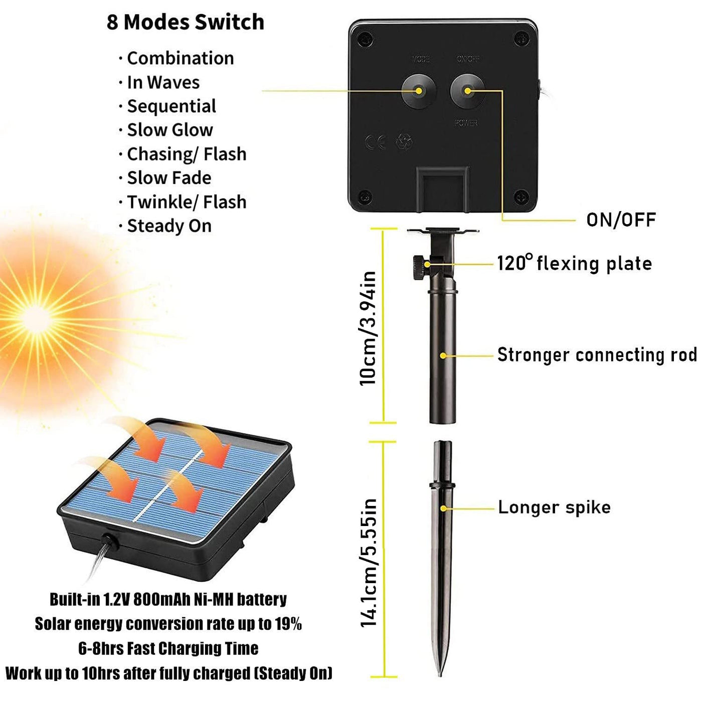 Ruichen Solar String Lightsnew Solar Panels, Up To 19% High Energy Conversion Rate Comparing To Others' 13%, It Can Provide More Energy, They'Re Environmental Protection And Energy Inexhaustible. Ip65 Waterproof Coefficient, Not Afraid Of Rain. Christmas, Wedding, New Year'S And Birthday Parties Will Glow With Creativity When You Include These Bendable And Flexible Lights To Your D Cor.Specifications:Length Of Rope: 16.5Ft. | Length Of Lead: 6.6Ft/2M | Led Quantity: 50 Leds. | Lamp Spacing: 3.94In/10Cm | Solar Panel Voltage: 2V | Ni-Mh Battery: 800Mah | Charging Time: 5-7Hours | Working Time: 10Hours | Working Temperature: -25~60?Warm Tips:1. These Solar Rope Lights Are Not Fully Charged Upon Arrival. Please Put Them Under The Direct Sunlight For 5-7 Hours To Get Fully Charged.2. Please Turn These Lights On At First Before Charging, Then It Will Be Charged Automatically.3. Please Do Not Immerse Them In The Water. After Receiving The Solar Lights, Please Tear Off The Transparent Protective Film On The Solar Panel.4. The Solar Rope Lights Will Work For Over 10 Hours With A Fully Charged. The Working Time Varies With The Intensity Of Sunlight, Location, Weather Conditions And Season Shifts.5. The Rope Light Is Mainly Used For Decoration, And The Brightness Cannot Be Used As A Lighting Fixture. Please Consider Carefully The Requirements For The Brightness Of The Light.Package Include:1X 16.5Ft/5M 50Led Rope Light + 6.6Ft/2M Lead Wire1X Solar Panel1X Spike1X User Manual