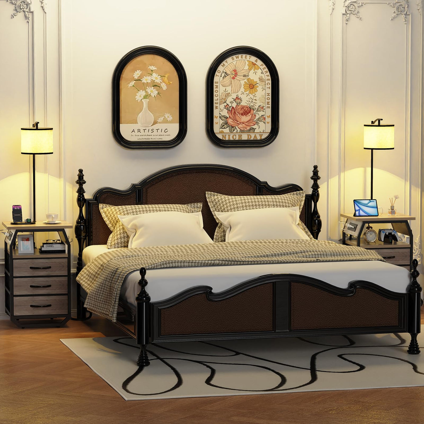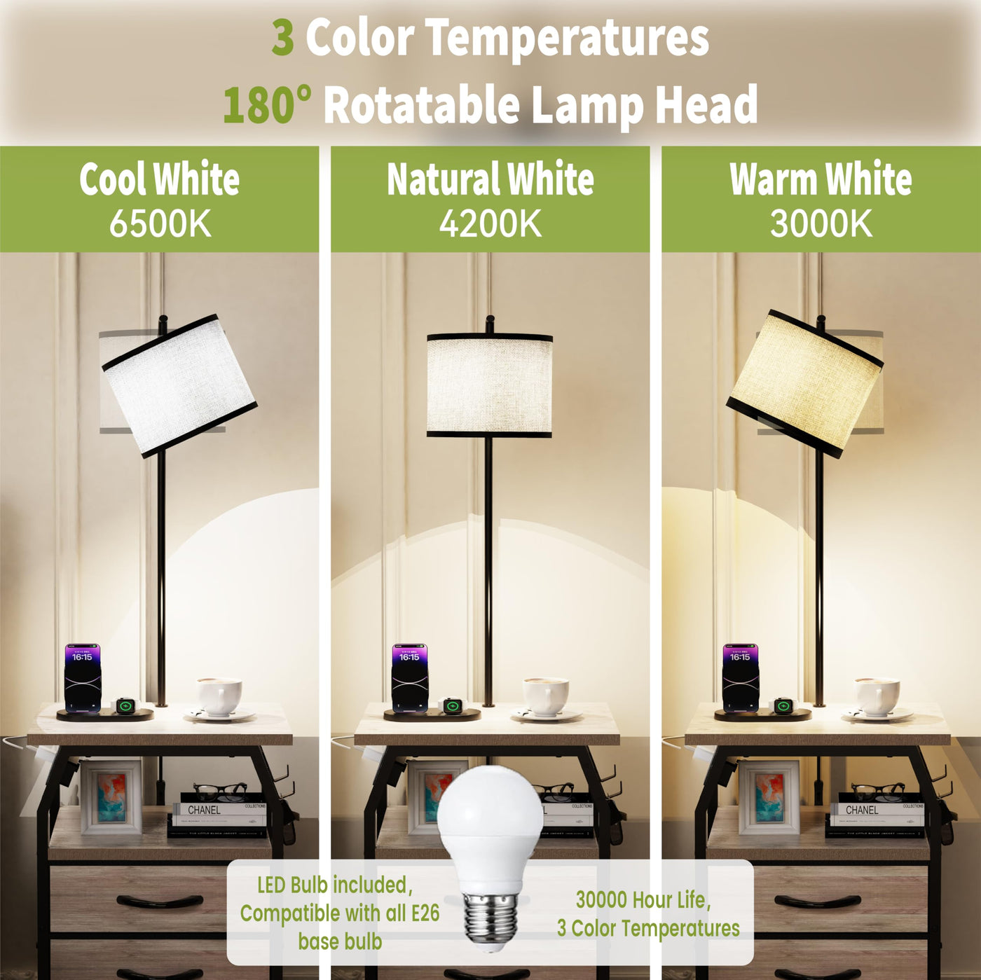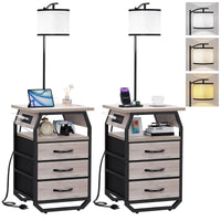 runjuly floor lamp with table is a quick and simple way to update your home! Our night stand with lamp set of 2 has 4 colors to choose 1. Dimension: 14.2''D x 17.7''W x 56.7''H 2. 2 Nightstads in one pack 3. The lampshade can be rotated 180 degrees 4. Charging Station: 2 power AC outlets, 2 USB, and 1 USB C ports 5. Long Power Supply Cord: 5 ft long power supply cord 6. 3-color Temperature E26 bulb (3000K-4200K-6500K/7W/600 lumens). It saves over 85% on electricity costs and has a lifespan of up to 100,000 hours. 7. Tight and Stable Structure: The reinforced metal frame and high-quality MDF board offer a large weight capacity. The top shelf can hold up to 120 lbs 8. Large Drawer with Storage Space: 3 large fabric drawers and 2 iron hooks 9. All the necessary accessories instruction guides and tools are included in the package