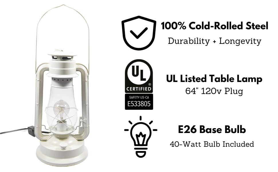 Introducing Our Beautifully Crafted Large Rustic Table Lantern, Designed To Elevate Your Home Decor With A Perfect Blend Of Vintage Charm And Modern Functionality. This Lantern-Style Table Lamp, Featuring A Stunning Powder Coat Finish, Adds A Touch Of Rustic Elegance To Any Room, Making It A Versatile Addition To Various Decor Styles. Crafted From Durable Cold-Rolled Steel And Equipped With A Real Glass Globe, The Lantern Exudes An Authentic Vintage Appeal That Enhances The Ambiance Of Any Space. Standing At 15 Inches Tall With A 7.75-Inch Diameter Base, This Lantern Is Sturdy And Stylish. Its Quick-Release System Allows For Effortless Bulb Replacement, Ensuring You Can Maintain The Perfect Lighting. The In-Line Dimmer Switch Offers Customizable Lighting, Allowing You To Create The Ideal Ambiance For Any Occasion. Whether You Need Bright Light For Reading Or A Soft Glow For Relaxation, This Lamp Provides The Flexibility To Suit Your Needs. The Rustic Table Lantern Comes Equipped With A 64-Inch Ul Listed Cord, Providing Ample Length For Versatile Placement Options Throughout Your Home. It Includes A Dimmable Bulb, Perfect For Creating A Warm, Inviting Atmosphere. Please Note That This Lantern Is Suitable For Dry Locations Only. Our Commitment To Quality Is Backed By A 1-Year Manufacturer? Warranty, Covering Any Factory Defects To Ensure Your Satisfaction. Please Be Aware That The Bulb Is Not Included In The Warranty. Safety Is A Top Priority, And Our Lantern Table Lamps Are Now Ul/Ulc Listed, Guaranteeing They Meet The Highest Standards For Electrical Safety And Performance. This Certification Provides Peace Of Mind, Knowing Our Products Have Been Rigorously Tested For Reliability And Safety. Illuminate Your Space With The Timeless Elegance And Reliable Performance Of Our Rustic Table Lantern, A Beautiful Addition To Any Home.