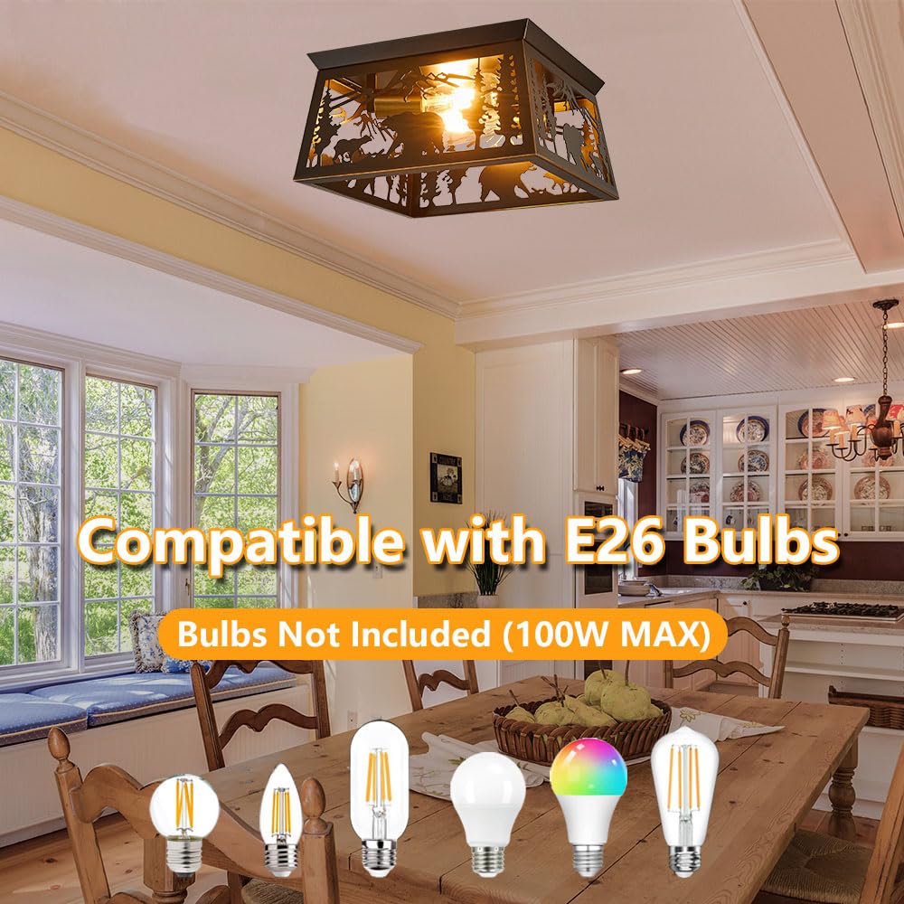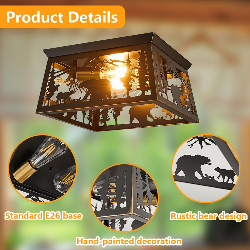 Rustic Light Fixture, 2-Light Farmhouse Flush Mount Ceiling Light Fixture, Metal Bear Country For Bedroom Foyer Entryway Hall Li