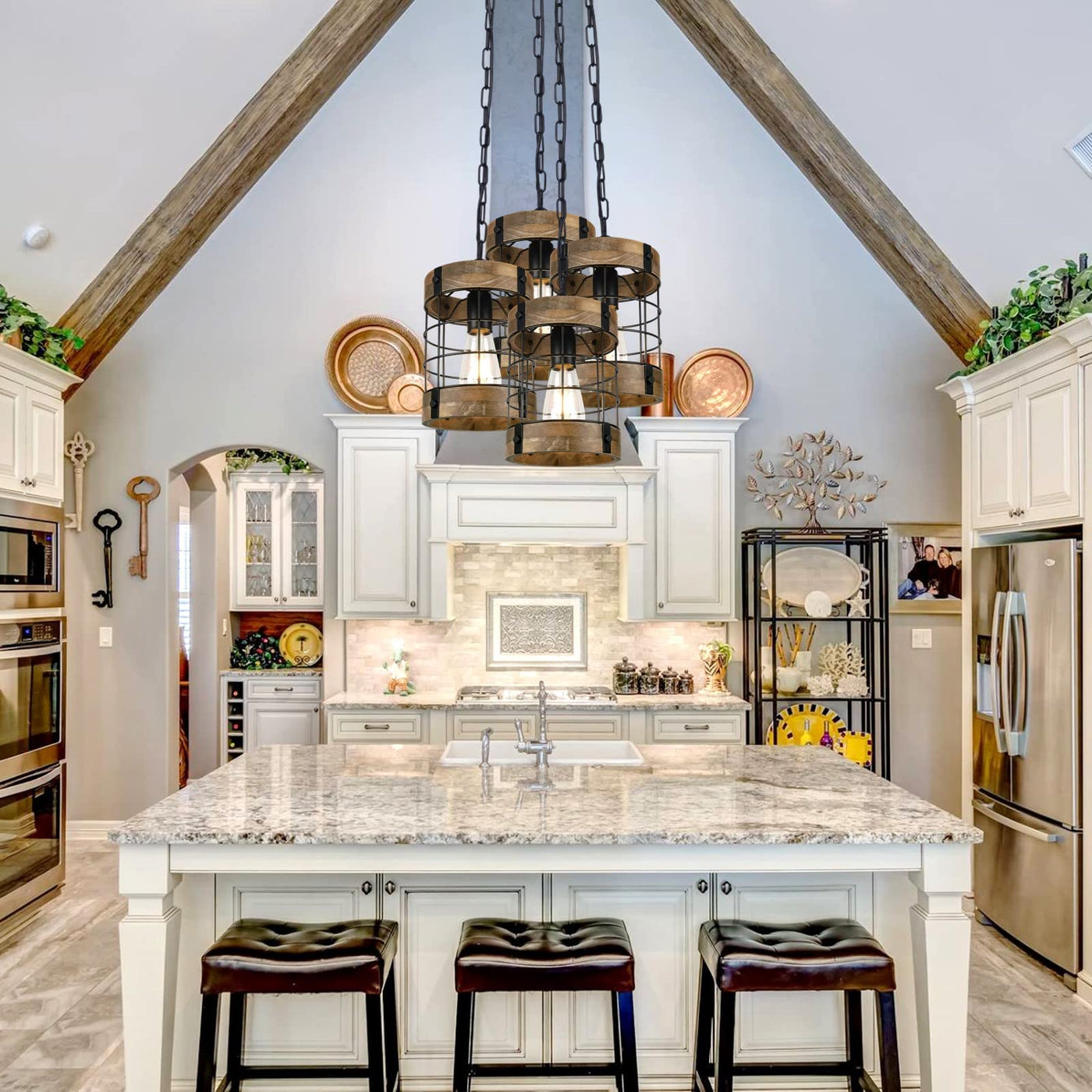 Q: What styles does the Rustic Pendant Light Fixture complement?A: The Rustic Pendant Light Fixture is designed to complement rustic and farmhouse styles, making it an excellent addition to spaces inspired by modern farmhouse aesthetics, barn designs, and industrial decor.
