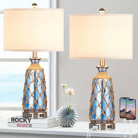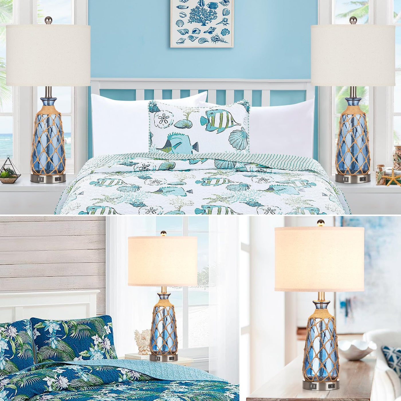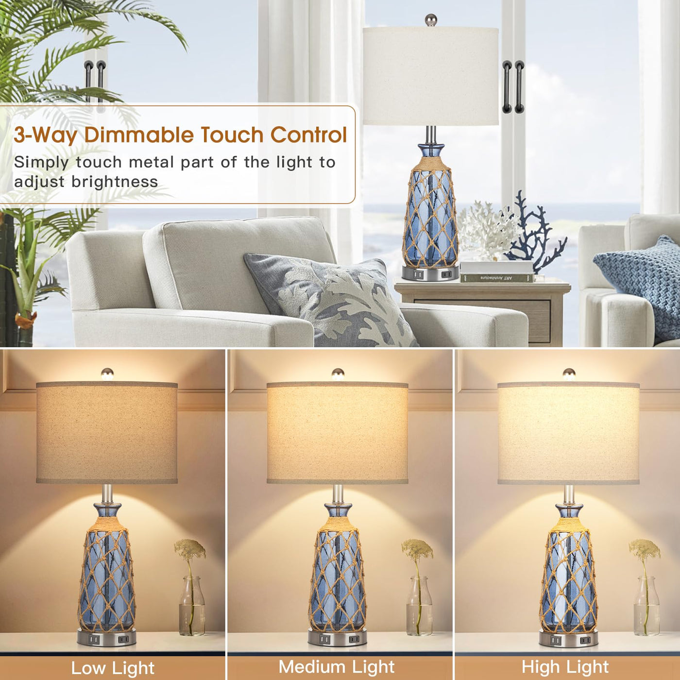 Ruzectt 25.5'' Coastal Glass Table Lamps Set Of 2, 3-Way Dimmable Touch Control Bedside Lamps With 2 Usb Ports And Ac Outlet, Bl