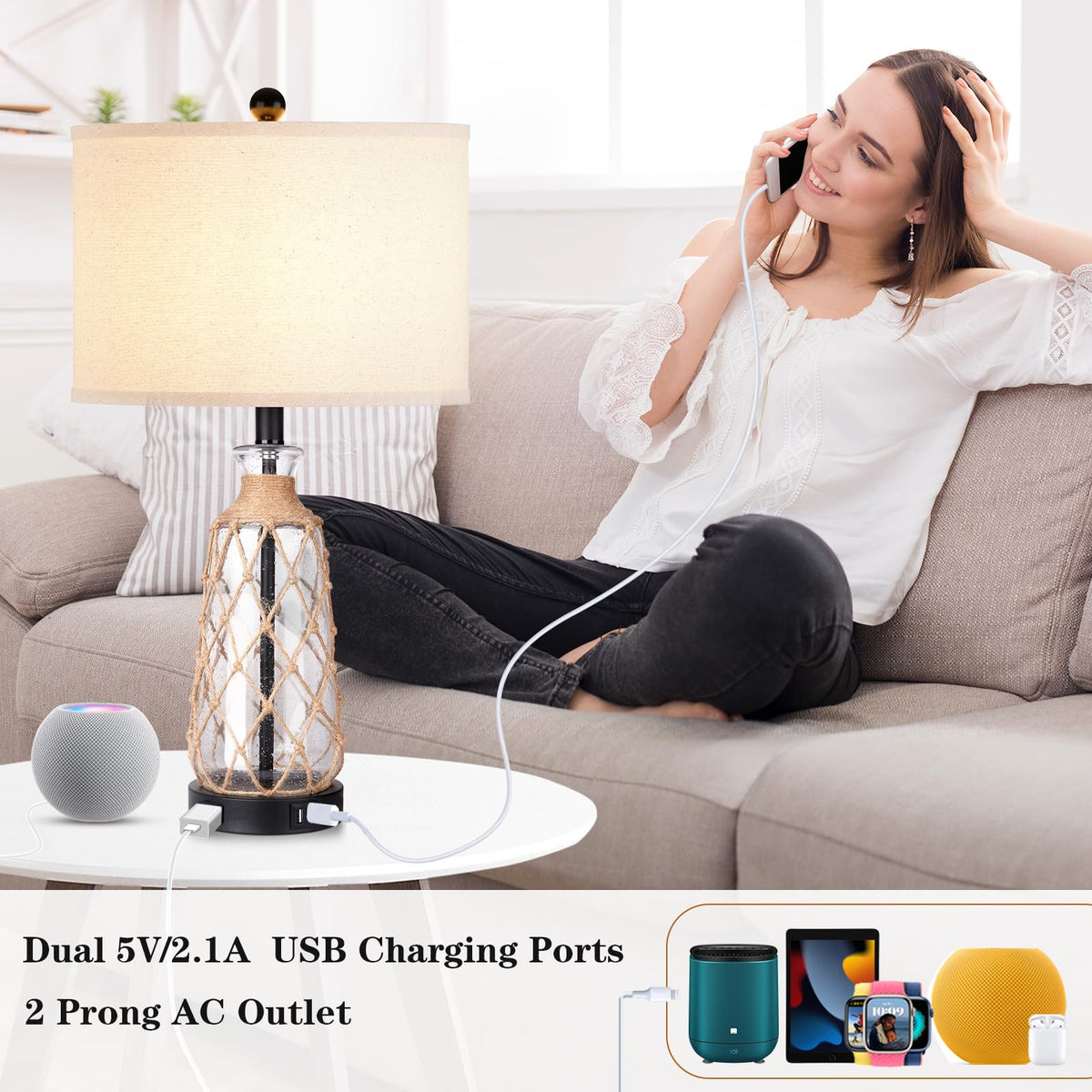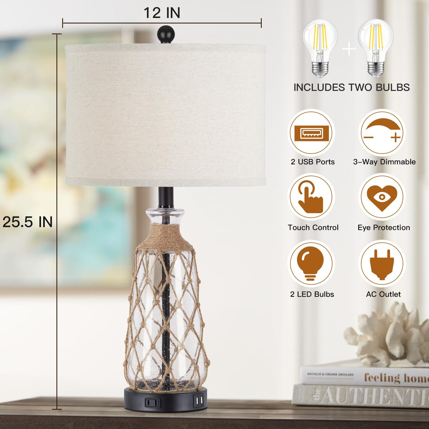 Ruzectt 25.5" Coastal Glass Table Lamps Set Of 2, 3-Way Dimmable Touch Control Bedside Lamps With 2 Usb Ports And Ac Outlet, Clear Nautical Nightstand Lamp For Bedroom Living Room (Led Bulbs Included)