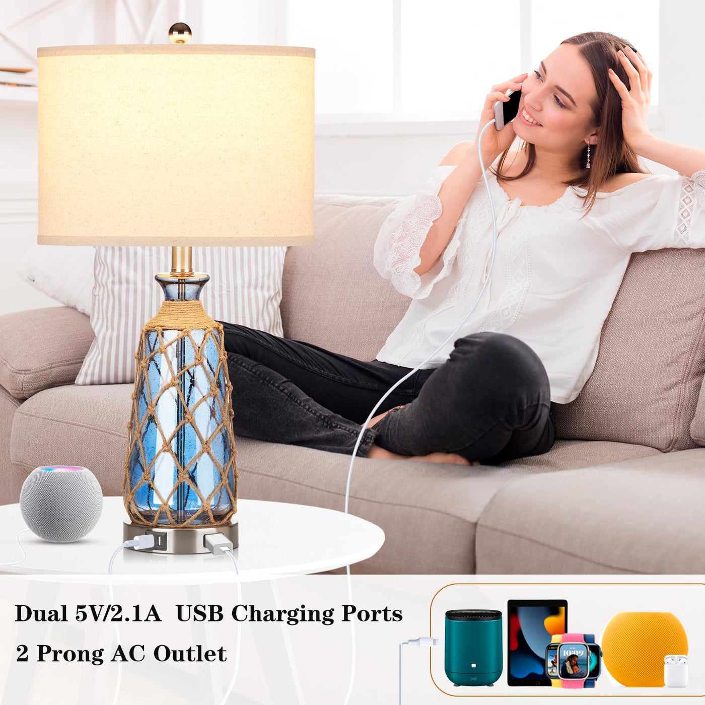Ruzectt Coastal Glass Table Lamps, 3-Way Dimmable Touch Control Bedside Lamps With 2 Usb Ports And Ac Outlet, Blue Nautical Nigh