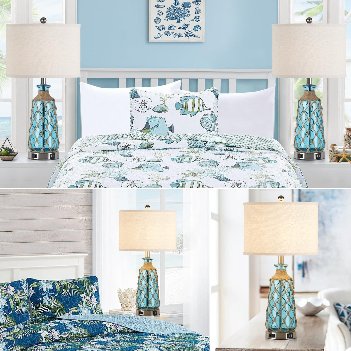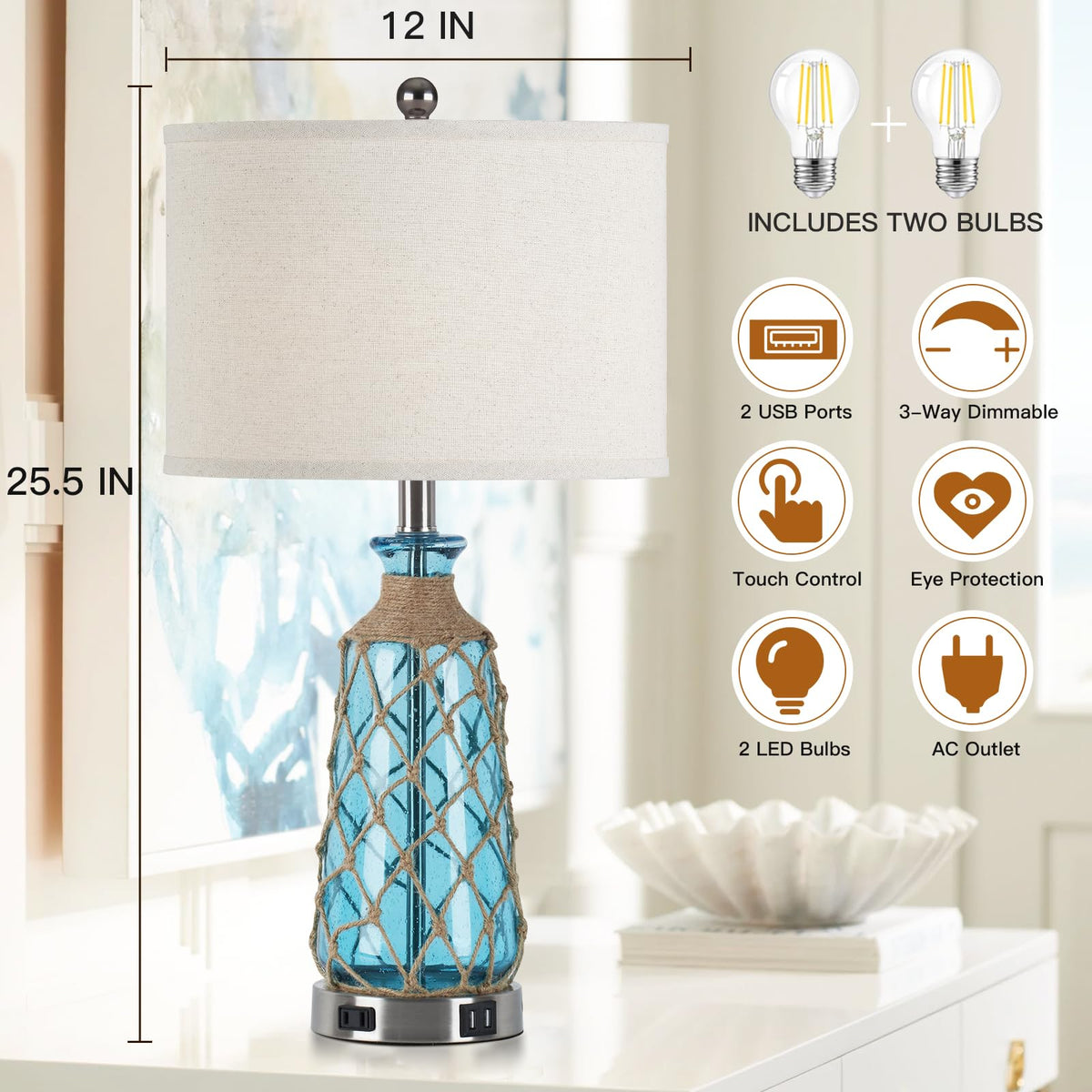 Ruzectt Coastal Glass Table Lamps, 3-Way Dimmable Touch Control Bedside Lamps With 2 Usb Ports And Ac Outlet, Teal Nautical Nigh