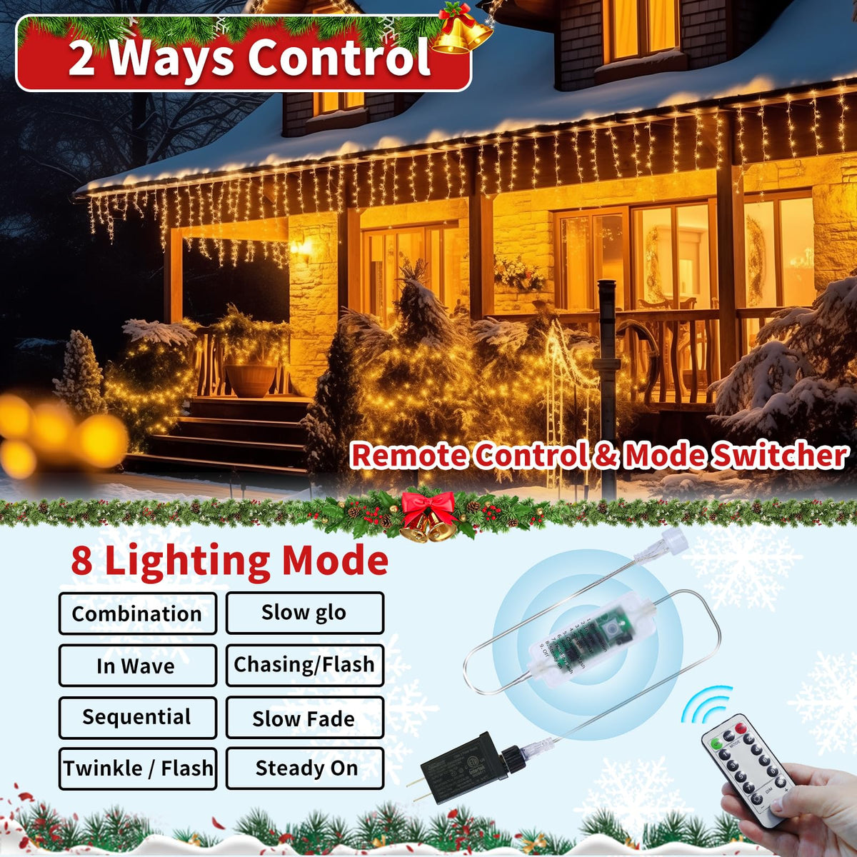 Q: What are the lighting modes available for the Ryblgled Plug-in Icicle Christmas Lights?A: The Ryblgled Plug-in Icicle Christmas Lights feature 8 different lighting modes that can be easily switched using the included mode switching line or the remote control. This allows you to customize the ambiance for your holiday decorations.
