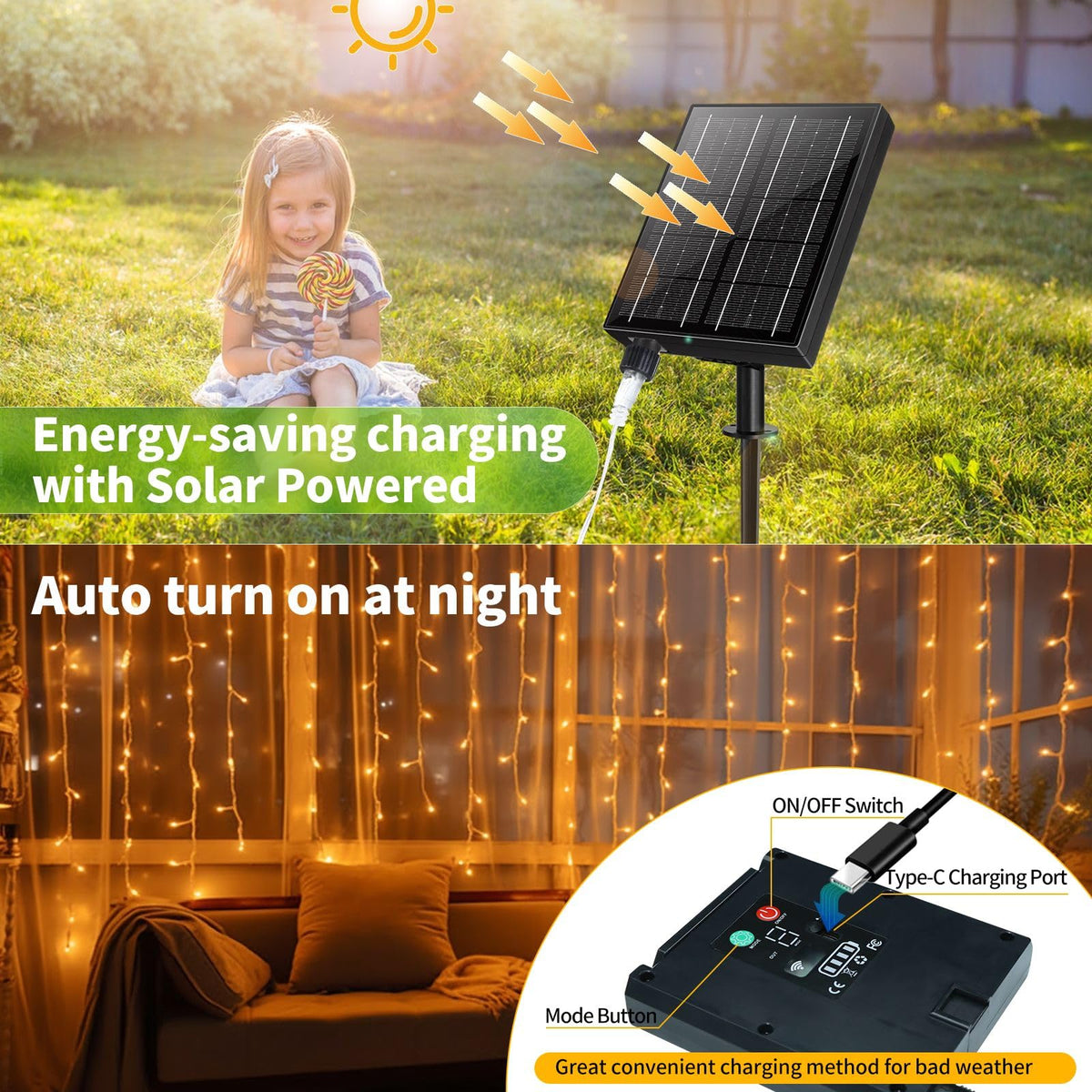 Transform Your Home Into A Winter Wonderland With These Solar Christmas Icicle String Lights. Powered By The Sun'S Energy, These Eco-Friendly Lights Are Not Only Environmentally Conscious But Also Cost-Effective, Eliminating The Need For Costly Electricity Bills. With Their Icicle Design, These Lights Create A Captivating And Festive Ambiance, Draping From Your Roofline Or Adorning Trees And Bushes. The Solar Panel Efficiently Charges During The Day, Allowing The Lights To Automatically Illuminate At Night, Providing Up To 8 Hours Of Brilliant Illumination. Featuring Durable Construction And Weather-Resistant Materials, These Lights Are Designed To Withstand The Elements, Ensuring They Remain Vibrant And Functional Throughout The Holiday Season. With Their Easy Installation And Maintenance-Free Operation, These Solar Christmas Icicle String Lights Are The Perfect Addition To Your Outdoor Holiday Decor, Creating A Magical And Enchanting Atmosphere For You And Your Loved Ones To Enjoy.