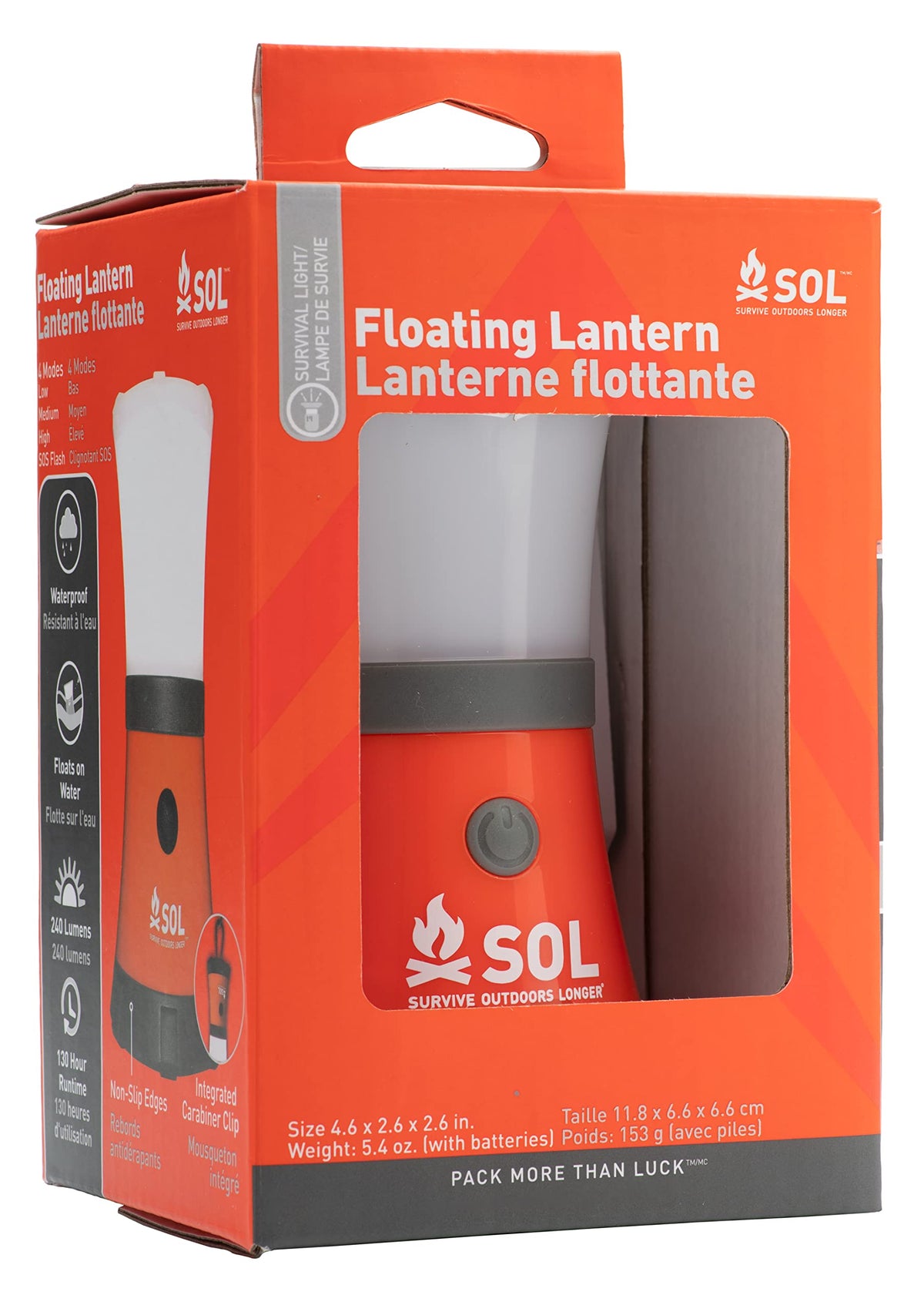Whether you're out for a paddle or the weather has turned at your campsite, the SOL Floating Lantern 4AAA will light your way. Pick the right light for the night with 4 lighting modes ranging from 20-240 lumens, and battery powered Flash lasting up to 150 hours. Don't worry if you leave the lantern out in a downpour, the IPX 7 Waterproof Rating has you covered. Hang off your kayak for a sunset cruise or hang from your tent with the integrated carabiner in the base. Extend the adventure into the night rain or shine, on land or water, with the battery powered SOL Floating Lantern.