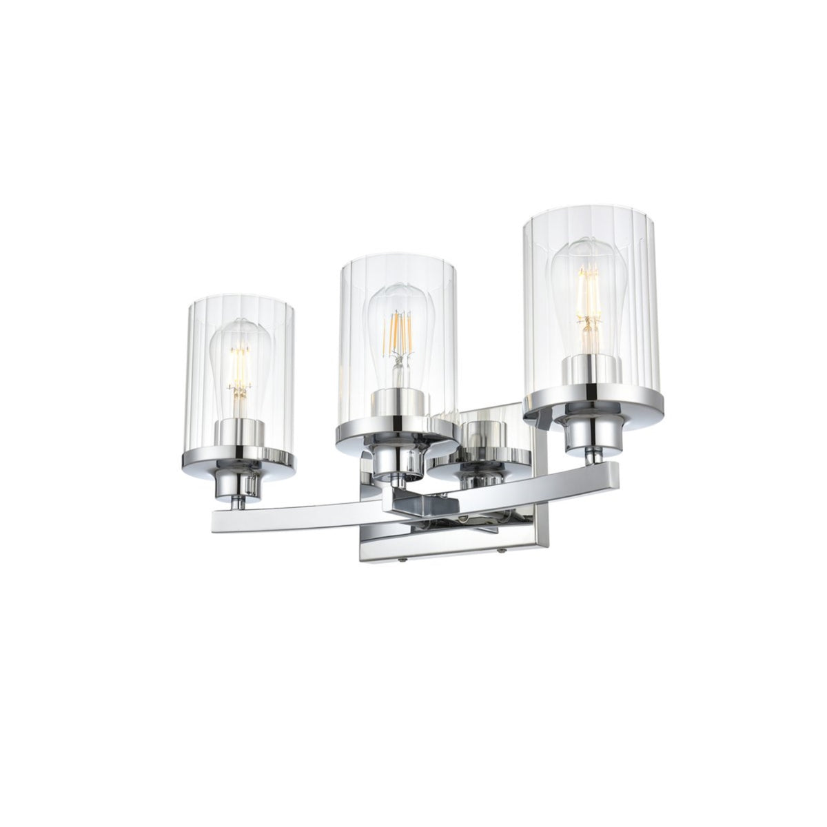 Q: What is the finish of the Living District Saanvi Bath Sconce?A: The sconce has a chrome finish combined with clear glass. This sleek finish enhances its modern look and complements various bathroom decors.
