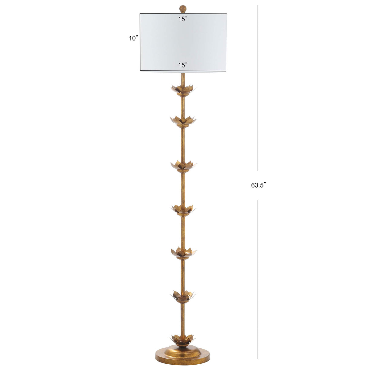 Q: What are the dimensions of the Safavieh Landen Leaf Floor Lamp?A: The floor lamp measures 15 inches wide, 15 inches deep, and stands at a height of 63.5 inches, making it a perfect fit for various spaces.