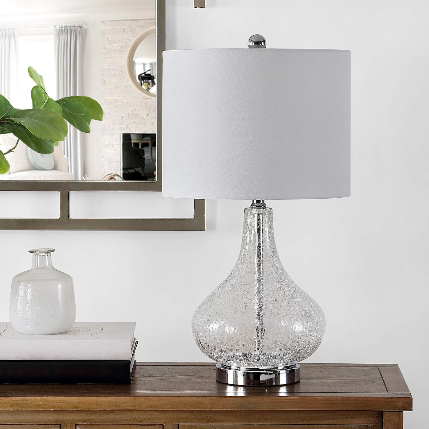 This Brooks Glass Table Lamp A Designer Must-Have In Contemporary Or Eclectic D Cor. Its Dramatic Curves And Elegant Clear Finish Shine Beautifully Beneath The Light Gently Diffused By Its Clean White Drum Shade.