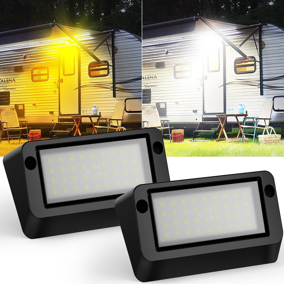 Safoner RV LED Porch Light - IP67 Waterproof, Aluminum, Dual Color White & Amber, 1400LM, 2 Pack, Black Housing