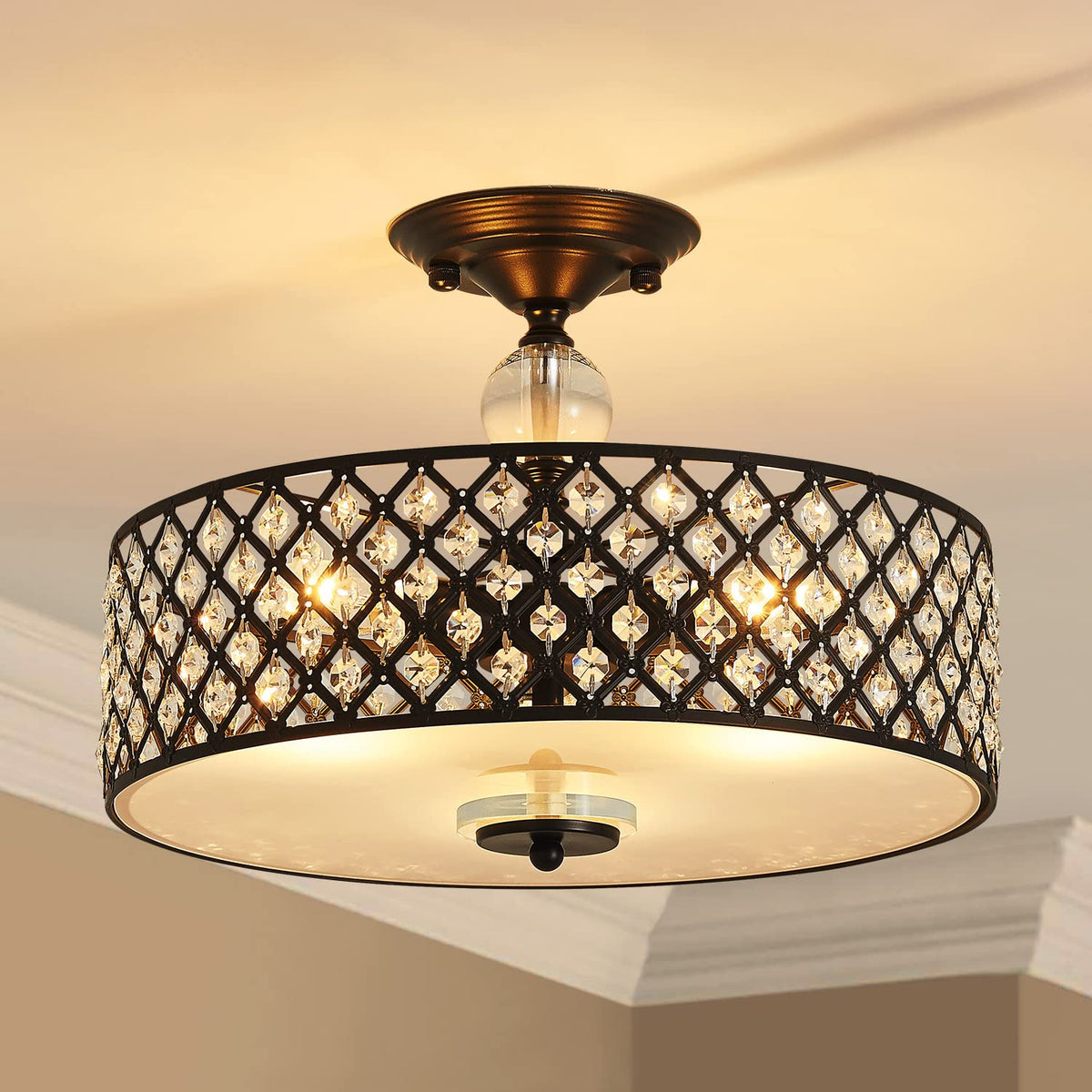 Saint Mossi Semi Flush Mount Ceiling Chandelier Modern K9 Crystal Ceiling Light Fixture For Dining Room Livingroom Bedroom H11 X D15.4 Matte Black Finish