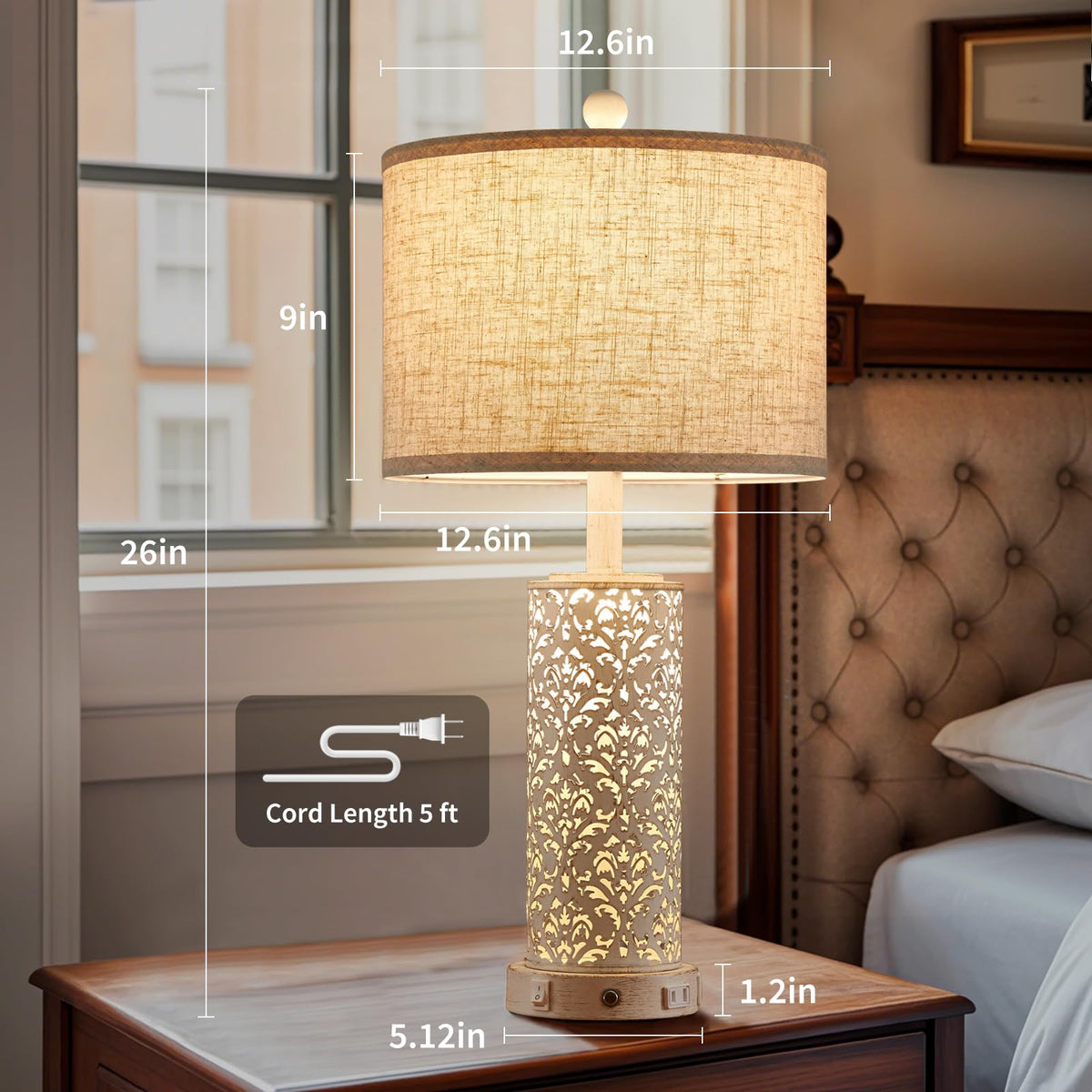 SAIWEYA 26 Farmhouse Table Lamp Dual Light, 3-Way Dimmable Touch Lamps, Rustic Nightstand Bedside Lamps with 2 USB Ports + AC O