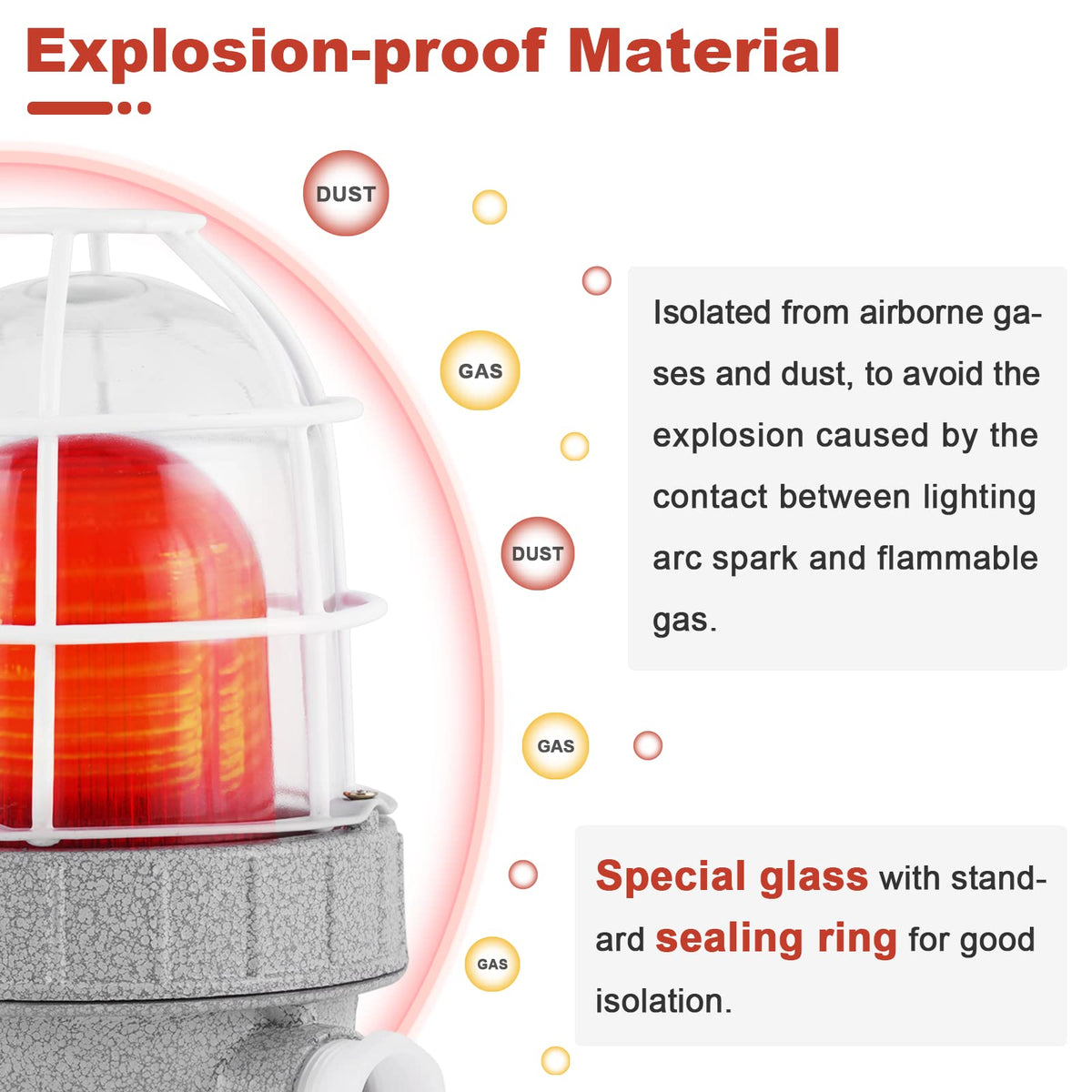 Q: What makes the Saladulce Industrial LED Warning Light explosion-proof?A: The Saladulce Industrial LED Warning Light features a thickened mesh cover and special glass designed to provide good isolation. It is equipped with a standard sealing ring to prevent airborne gases and dust from entering, minimizing the risk of explosion that could occur from contact between the lighting arc spark and flammable gas.