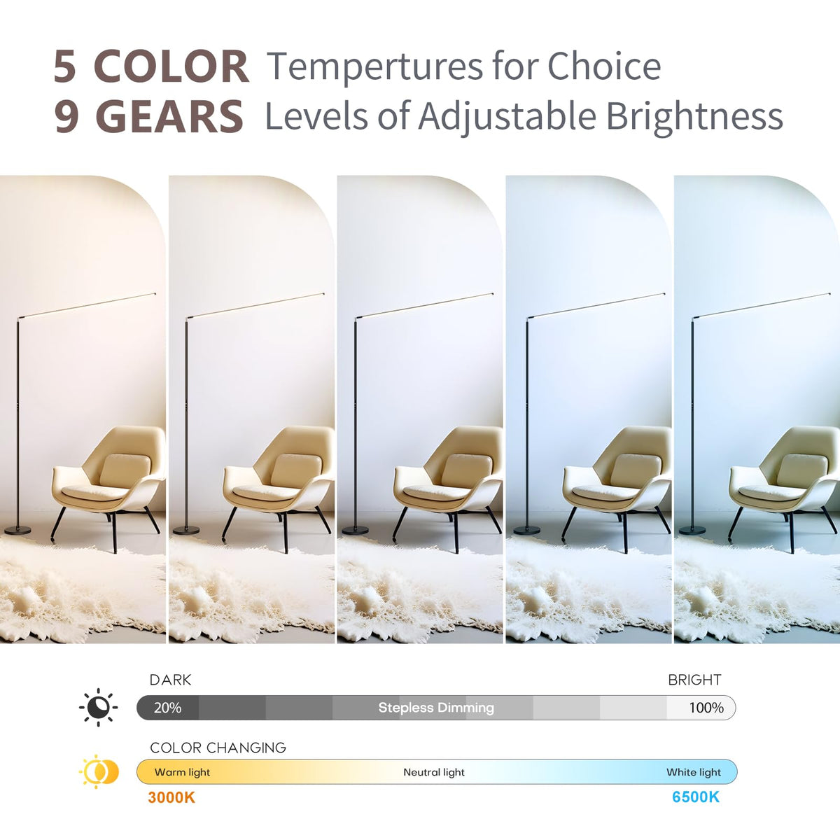 Q: What are the key features of the SAMPHON LED Floor Lamp?A: The SAMPHON LED Floor Lamp features a large lighting area with an 80cm long LED light source, offering both focused and wide-angle lighting. It includes 9 levels of brightness (20%-100%) and 5 color temperature settings (3000K-6500K) for customizable lighting. The lamp also has a touch control system for easy adjustments and an adjustable design for flexible positioning.