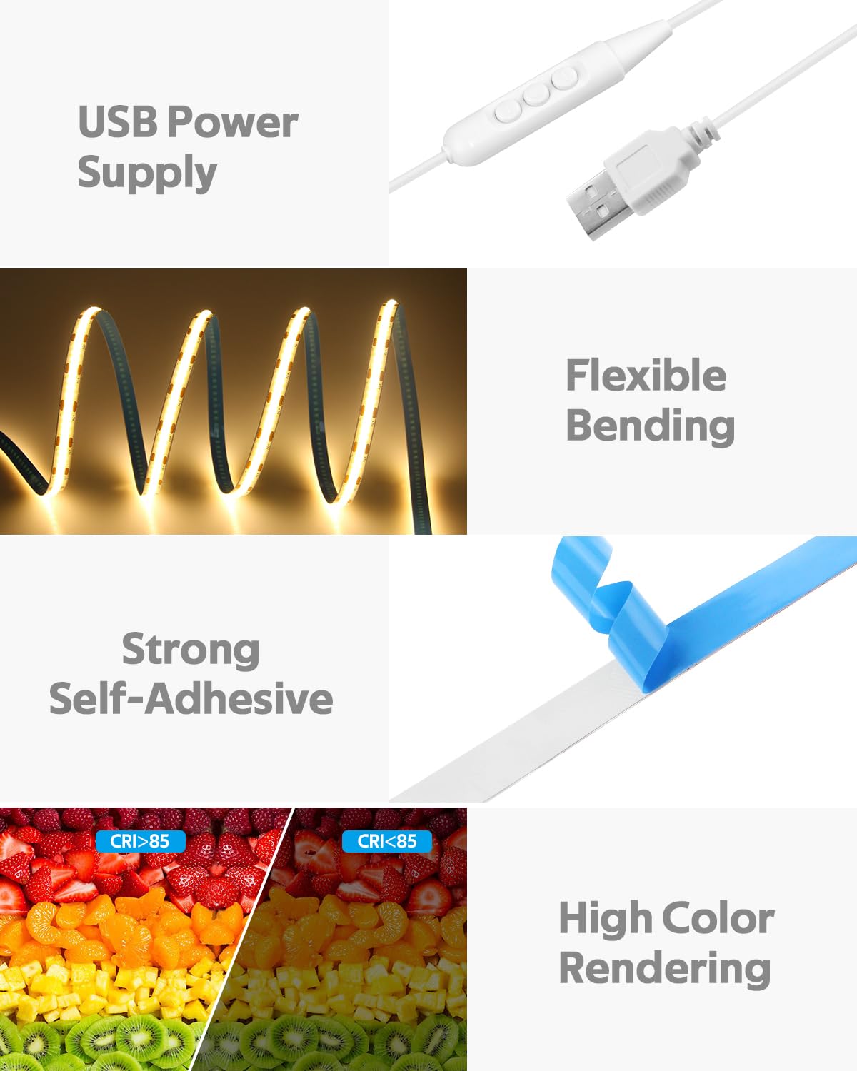 Q: What are the main features of the Samsion 5V COB LED Strip Light?A: The Samsion 5V COB LED Strip Light features a high density of 320 LEDs per meter, providing super bright and even illumination. It operates at a low voltage of DC 5V, ensuring safety and low heat generation. Additionally, it includes a USB power dimmer that allows you to adjust brightness from 10% to 100% based on your needs.