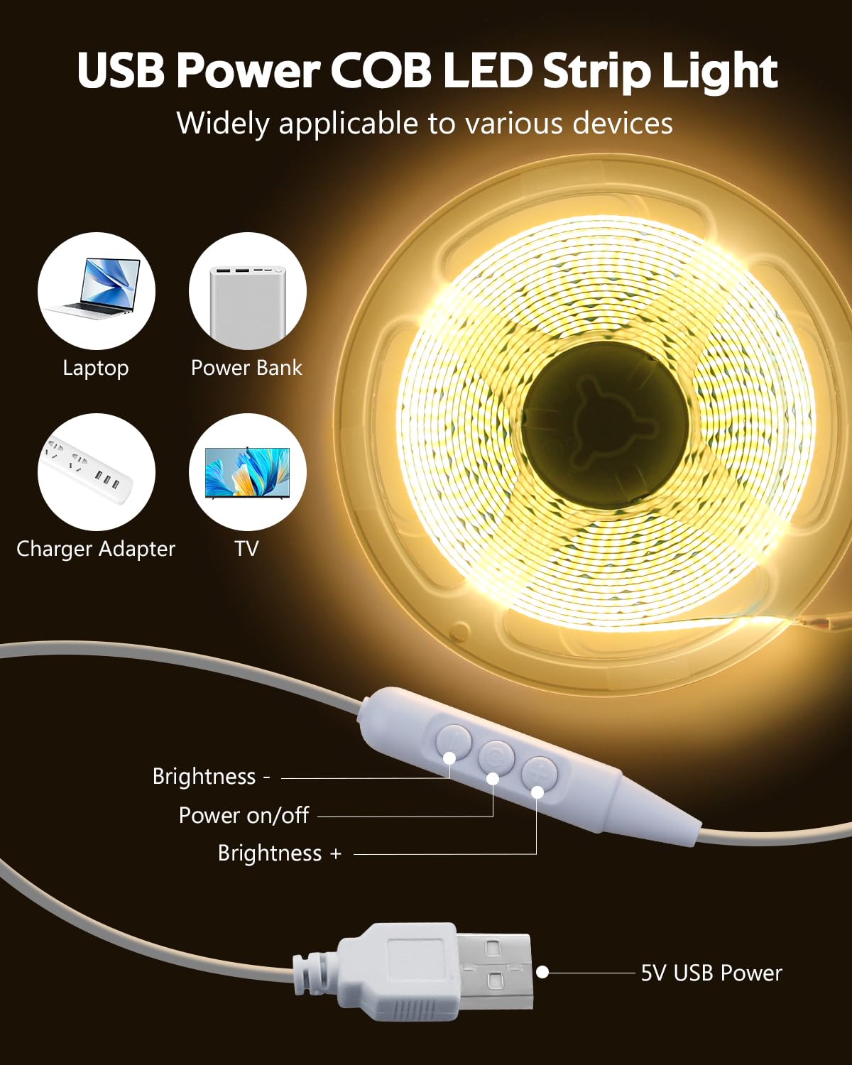 Samsion 5V Cob Led Strip Light For Bedroom 16.4Ft Usb Led Light Strip Warm White 3000K With Dimmer 320Leds/M Flexible Led Tape L