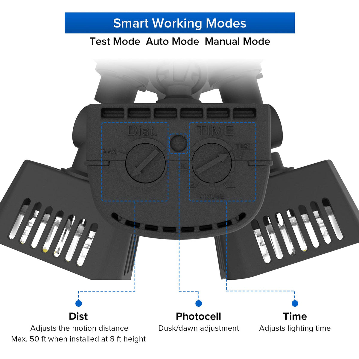 - **Smart Auto On/Off Function**: The dusk-to-dawn photocell ensures the light activates at nightfall and powers off at dawn, providing seamless operation. It detects motion within a 180-degree angle and up to 50 feet away, eliminating false triggers for reliable performance.