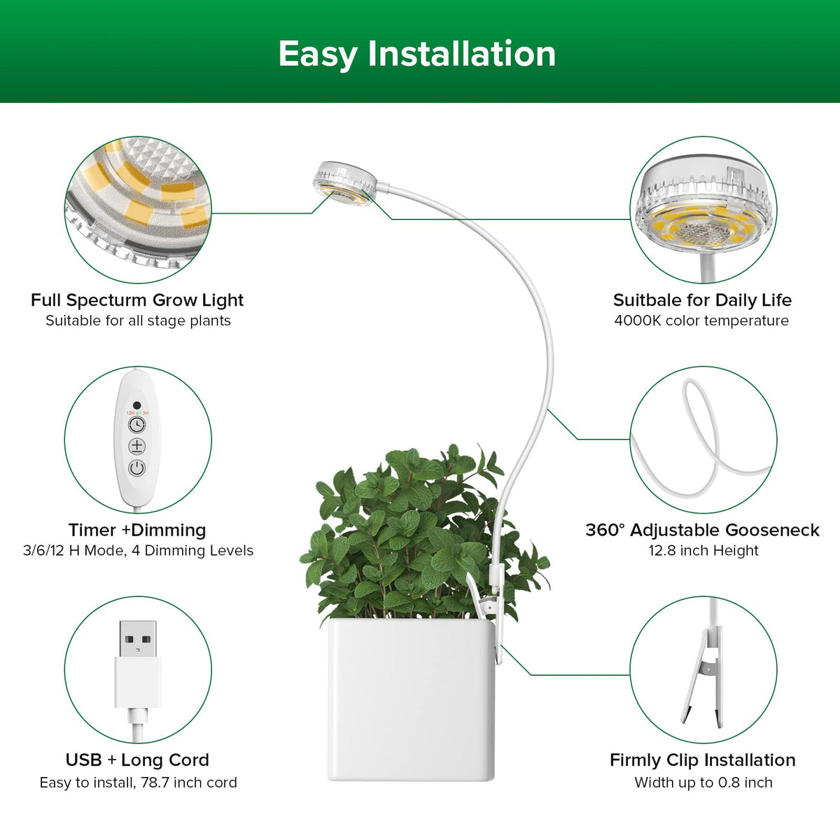 - **Flexible Placement Options**: The 360° gooseneck design allows for easy adjustment of the light direction, ensuring your plants receive the right amount of light from any angle. The included clamp makes it simple to install on pots, desks, or plant stands, providing versatility in your home or office setup.