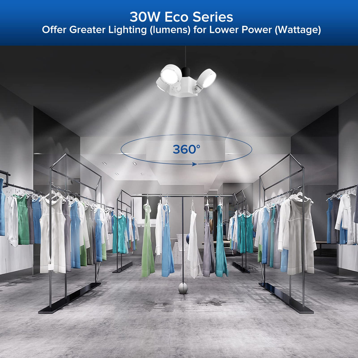 DEFORMABLE DESIGN SUPER BRIGHT:With 4 ceramic LED panels, and each LED panel can be folded up 135 degrees, the maximum coverage angle can reach 360 degrees,so that you can adjust them to any angle you need for creating more light in your space. | EASY TO INSTALL:This LED Garage Ceiling Light can be installed in a standard medium screw base (E26), installation is as easy as screwing in a light bulb. No tools no wiring or professional electricians needed. Easy and convenient. | BETTER PERFORMANCE AND LONG LIFE: Compared with common bulbs or shop lights, this 30w LED garage light utilizes our patented Ceramic Heat Dissipation Technology (CHDT), by which lighting performance and cooling efficiency are greatly improved, giving it up to 30, 000 hours longevity, lasting and consistent with a high performance. | ENERGY SAVING WIDE APPLICATIONS:With 5000K daylight color temperature, The light only consumes 30w, equivalent to a 240-watt incandescent bulb, save up to 60% compared with traditional garage light bulbs. It can be used in garages, basements, workshops, utility and recreation rooms, storage rooms, barns etc. | GUARANTEES: You are covered for replacement or refund regarding any quality issues