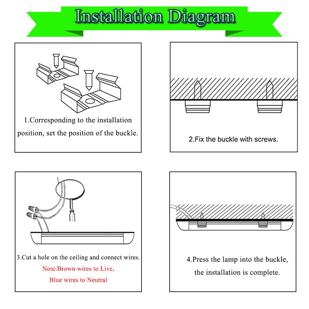 Q: How do I install the Sararoom LED Shop Light Fixture?A: Installation of the Sararoom LED Shop Light Fixture is straightforward. The fixture can be surface mounted to walls or ceilings, and it comes with included mounting hardware. Simply connect the brown wire to the live wire and the blue wire to the neutral wire as instructed.