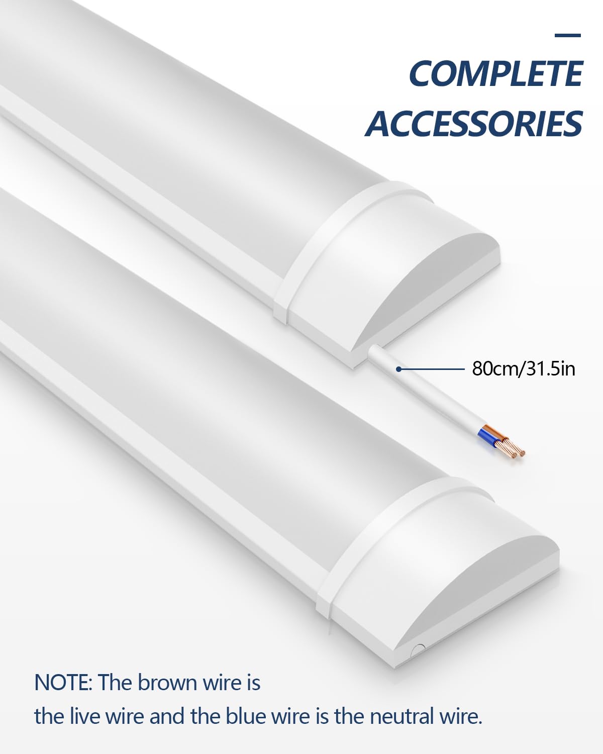 Specifications: Product Name: LED LED Shop Lights for Garage Wattage: 20W Luminous Flux: 2400LM Certification: CE, FCC, ROHS LED Chip Type: SMD2835 LED Quantity: 96 pcs Beam Angle: 130° Input Voltage: AC85-265V Length: 2ft/60cm Cable Length: 20 cm Dimmable: No Dust-proof: IP20 CRI: 70 PF: 0.65 Material: Top quality Aluminum body + superior PC cover LED Average Life : More than 30000 hours Work Temperature : Minus 20 to 60 degrees Color Temperature: 3200K(Warm white) & 4000K(Neutral white) & 6000K(Cold white) Product Dimension and Weight: 60(L)*8(W)*2.5(H)cm, 208.5g (Not include the package) Package Dimension and Weight: 63(L)*8(W)*3(H)cm, 267g (include the light)
