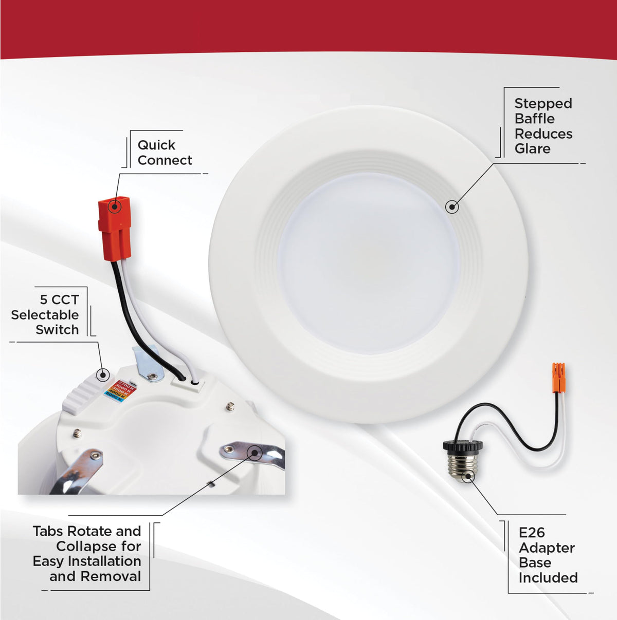 Satco Led Retrofit Downlight With Stepped Baffle, Cct Selectable 2700K/3000K/3500K/4000K/5000K, 4 Inch Round, White