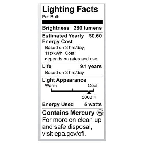 Satco S7266 5-Watt Candelabra Base T2 Mini Spiral, 5000K, 120V, Equivalent To 30-Watt Incandescent Lamp For Enclosed Fixtures