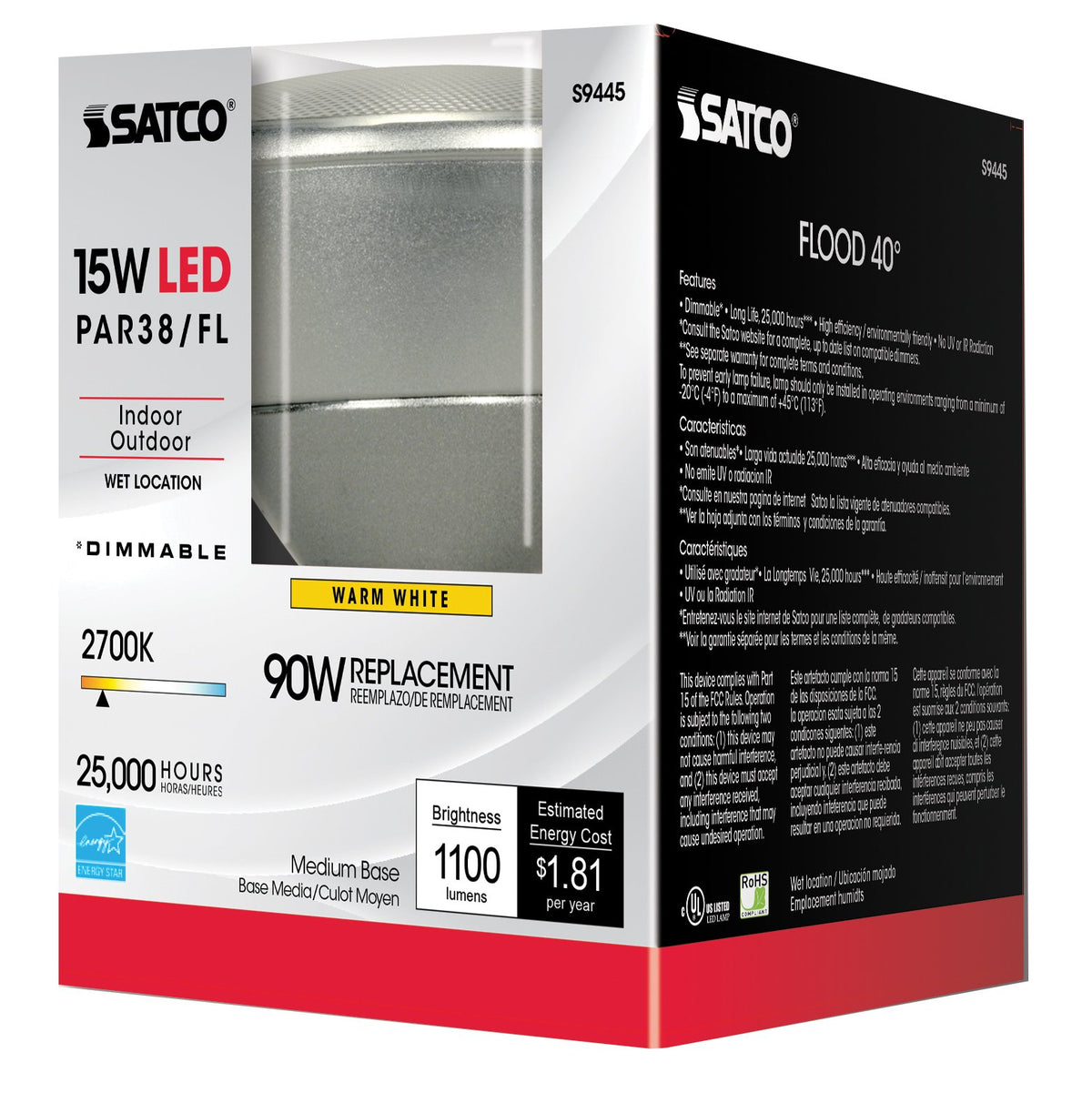 Satco S9445 Par38 Led 2700K 40' Beam Spread Medium Base Light Bulb, 15W
