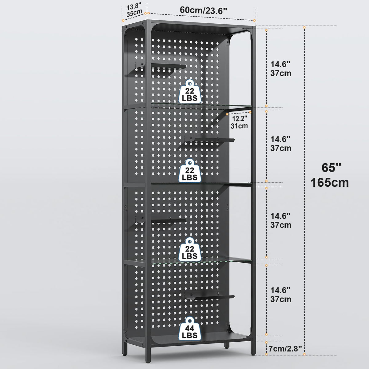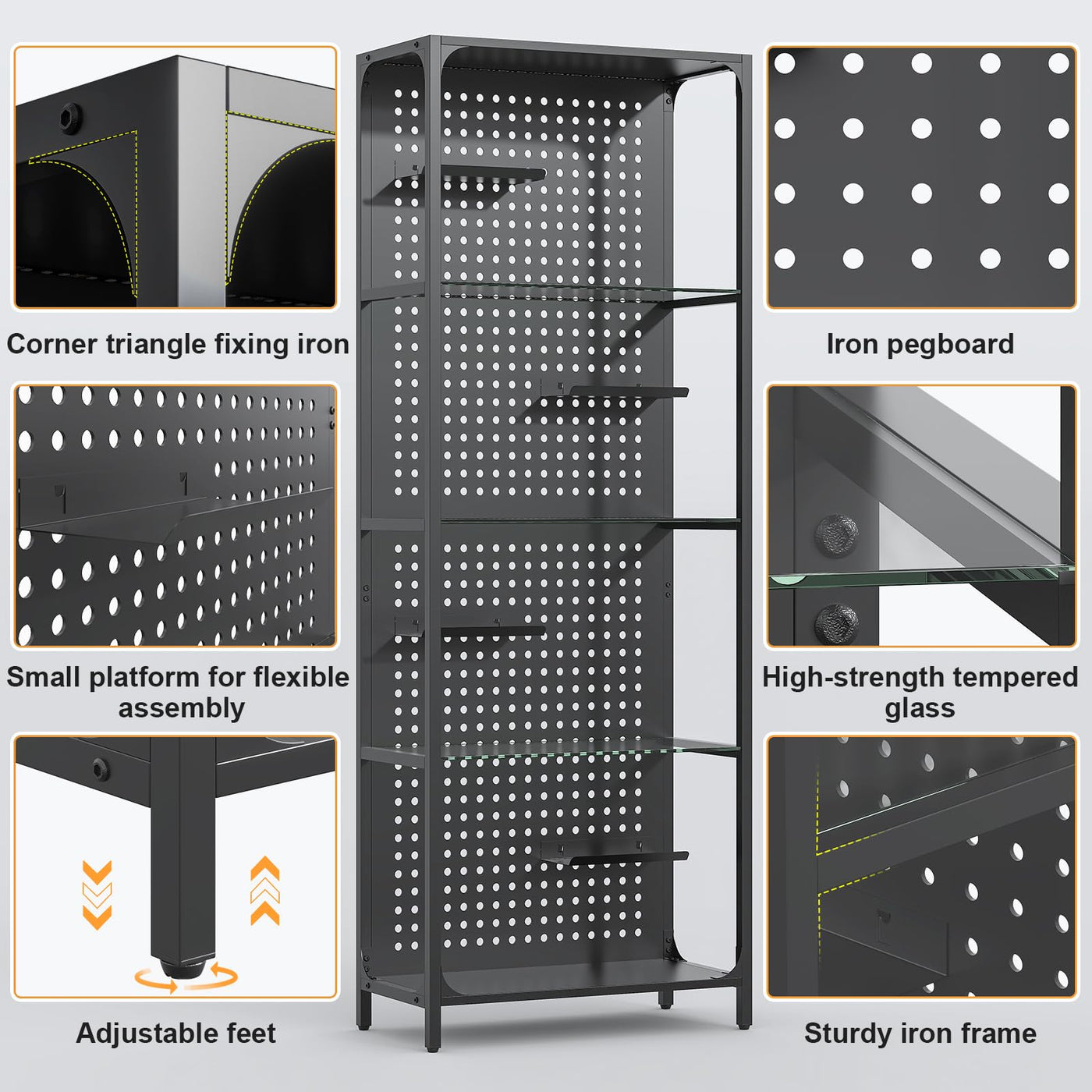 Q: What type of items can I store on the pegboard back of the shelf?A: The pegboard back of the Saudism display shelf offers additional storage options, making it ideal for hanging smaller collectibles, accessories, or decorative items, enhancing your display setup.