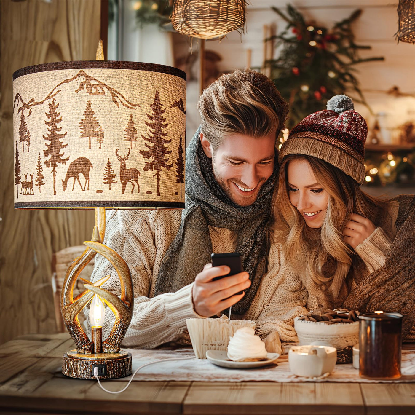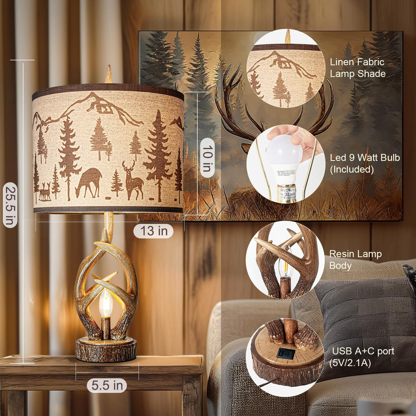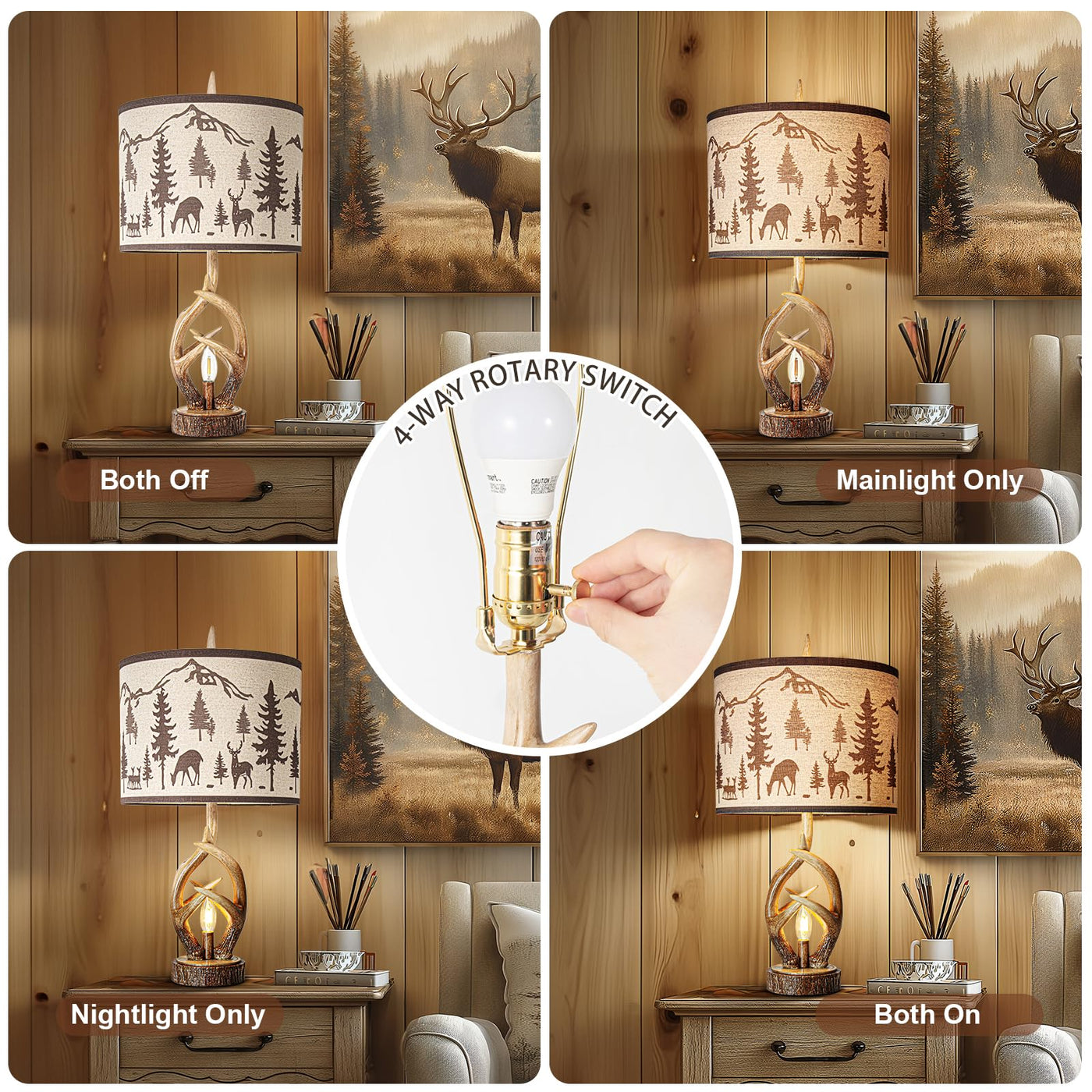 Scenekoy Antlers Style Table Lamp Set Of 2 Rustic Bedside Lamp With Night Light Linen Fabric Shade Farmhouse Nightstand Lamps Decor For Living Room Bedroom House Home Office (Bulb Included)