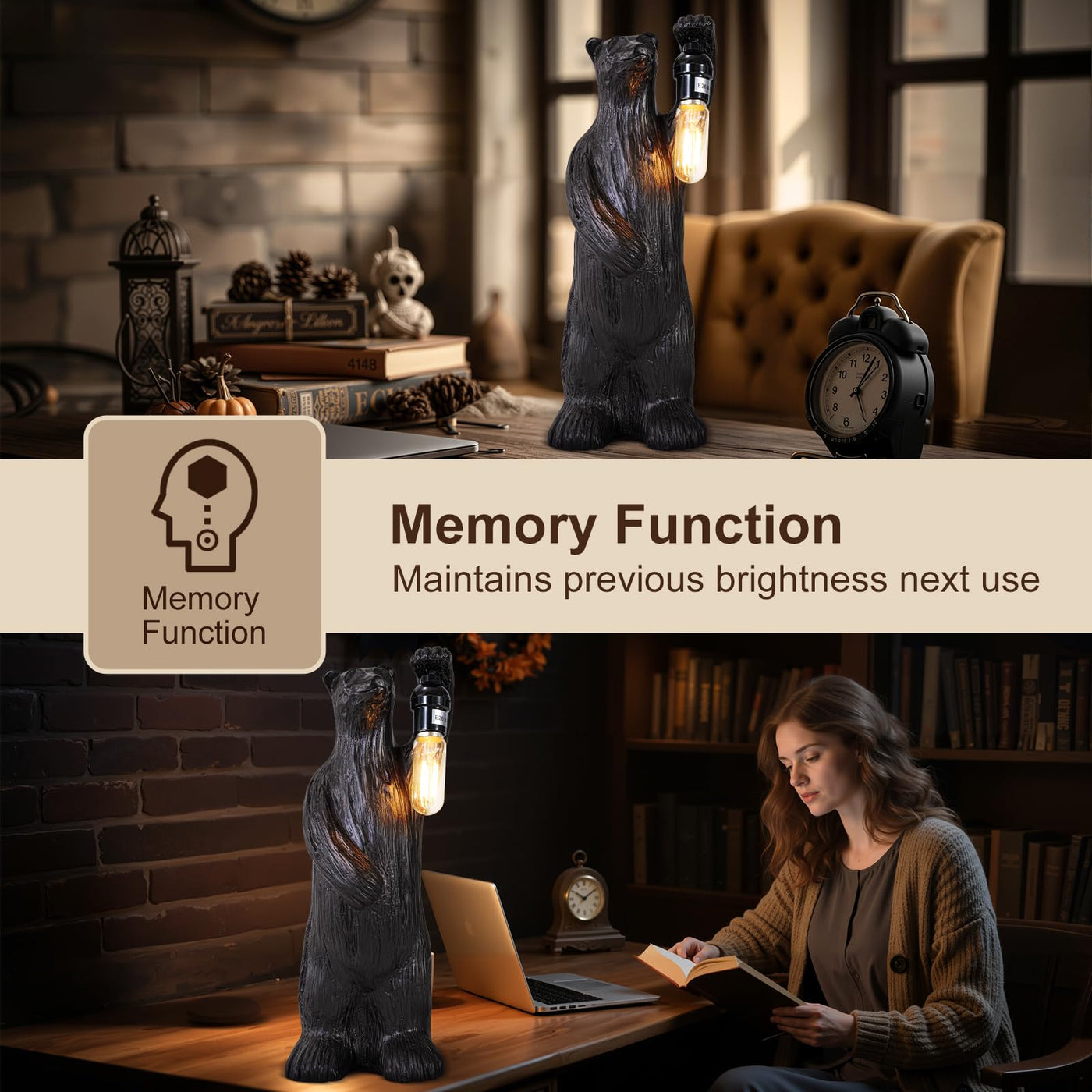 Scenekoy Bear Table Lamp For Living Room Bedroom, Memory Function, 3 Way Cycling Dimming, Resin Gothic Style Bedside Nightstand
