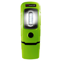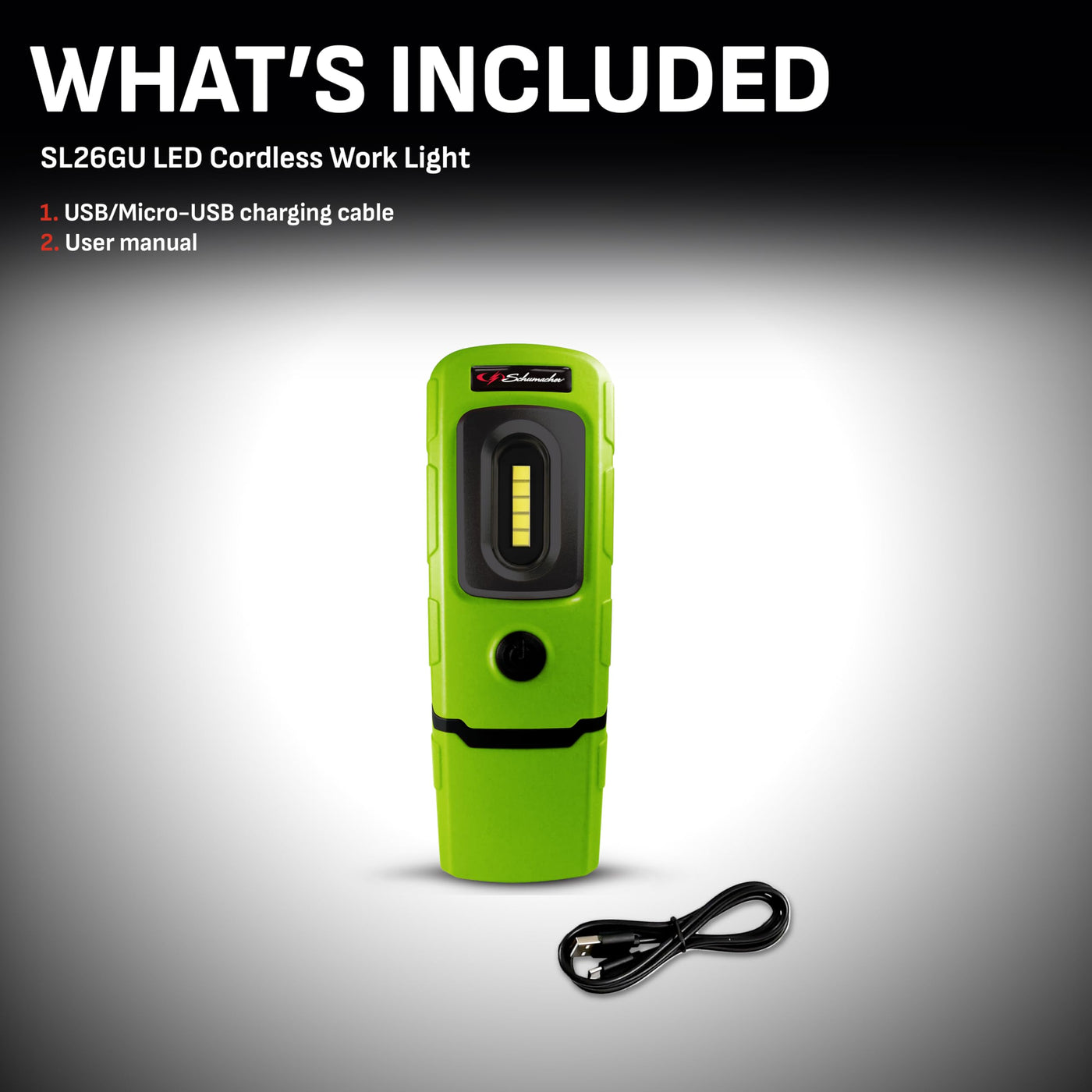 No toolbox is complete without a compact, portable work light. Available in limited edition electric green, the Schumacher SL26GU LED Cordless Work Light and Magnetic Torch is the perfect choice for professional craftspeople and hobbyists. The work light function features five super-bright SMD LEDs, which are smaller, brighter, and longer lasting than traditional LEDs. The Schumacher SL26GU has two lighting modes providing up to 200 lumens of illumination. A rechargeable 1500 mAh lithium ion battery delivers extended run times—360 minutes in flashlight mode and 180 minutes as an area light—while having a longer life and slower discharge than traditional Ni-MH batteries. A ball joint with 360° swivel and 90° tilt function makes multi-angle positioning possible, ensuring the light is aimed exactly where you need it. With a magnetic base and a foldable 360° swivel hook, you can even use the SL26GU hands free. Other features include soft touch rubberized casing and an included USB to micro-USB charging cable.