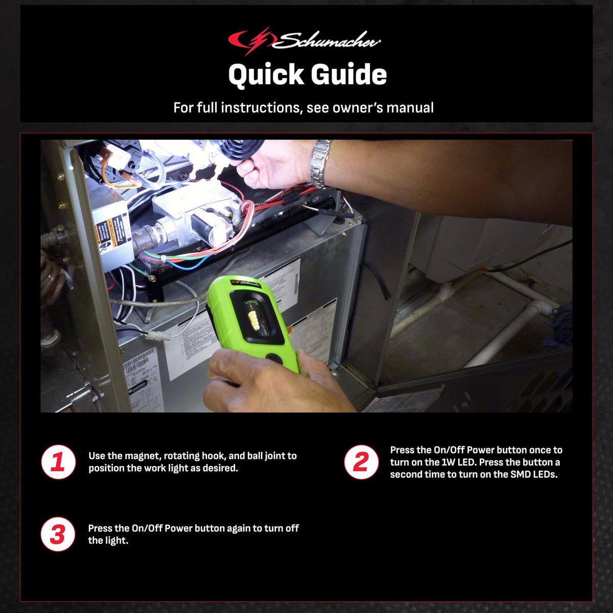 Q: What are the lighting modes available for the Schumacher SL26GU LED Work Light?A: The Schumacher SL26GU LED Work Light features two lighting modes, providing up to 200 lumens of illumination, making it suitable for various tasks such as home repairs, emergencies, and automotive maintenance.