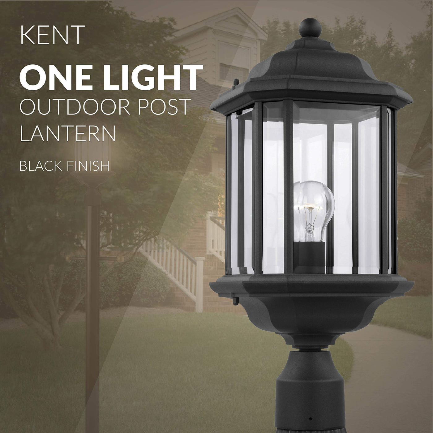 The Generation Lighting Kent one light outdoor post top in black enhances the beauty of your property, makes your home safer and more secure, and increases the number of pleasurable hours you spend outdoors. Kent outdoor lighting fixtures by Generation Lighting are crafted in die-cast aluminum for added durability to withstand harsh weather conditions. The traditional styling inspired by antique gas lanterns is offered in either Oxford Bronze with Clear Seeded glass, Black finish with Clear Beveled glass, and both finishes with Satin Etched glass. The assortment includes small and large one-light outdoor wall lanterns (with a flat bottom), as well as an additional design of small and large one-light outdoor wall lanterns (with finial on top and bottom) which can be mounted up or down, a one-light outdoor semi-flush convertible pendant and a one-light outdoor post lantern. Both incandescent lamping and ENERGY STAR-qualified LED lamping (for those fixtures with the Satin Etched glass) are available for most of the fixtures, and some can easily convert to LED by purchasing LED replacement lamps sold separately.
