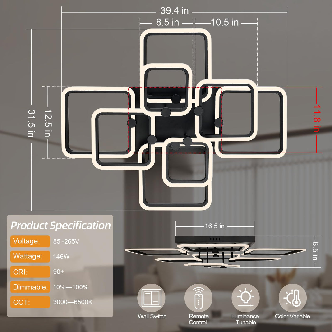 Q: What are the dimensions of the SEABLE Dimmable Modern LED Ceiling Light?A: The SEABLE Dimmable Modern LED Ceiling Light measures 39.4 x 31.5 x 6.5 inches, making it suitable for various indoor spaces.