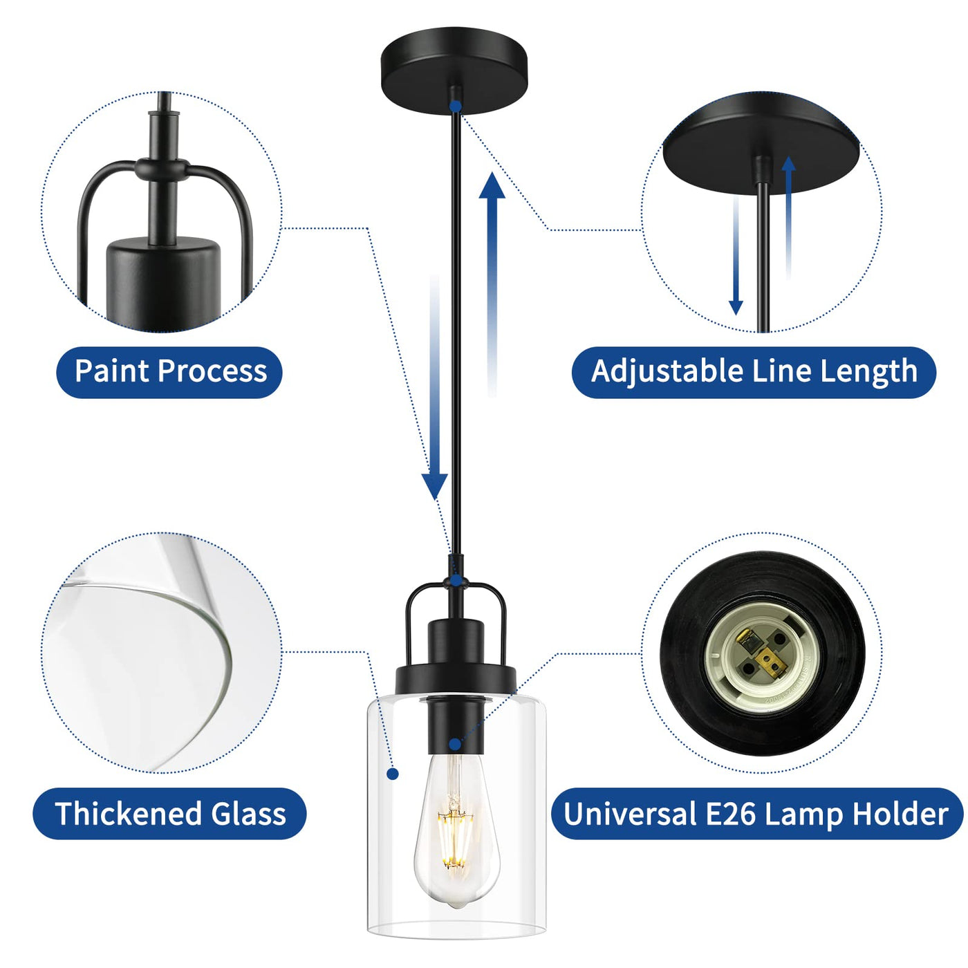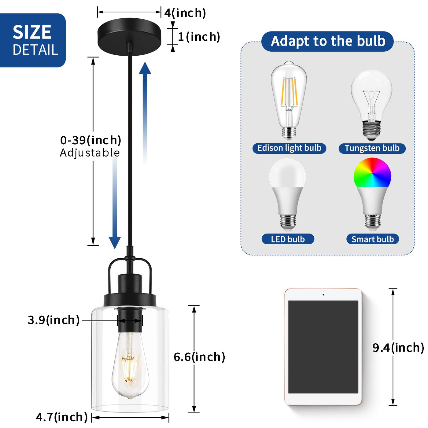 Q: How do I adjust the hanging height of the pendant light?A: The pendant light features a retractable cable that extends up to 39 inches, allowing you to easily adjust the hanging height to fit various ceiling heights. Simply pull the cable to the desired length during installation.