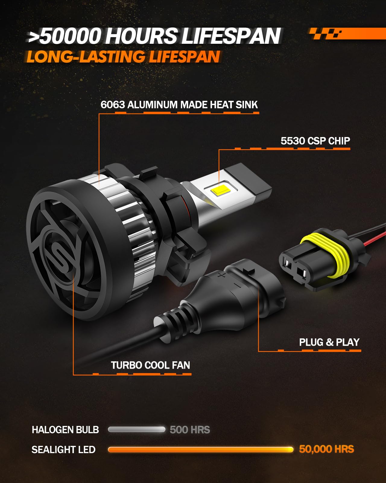 SEALIGHT 5202 LED Fog Light Bulbs Or DRL, 5201 PS19W PS24W Fog Lights LED Light for Car, 20000RPM Turbo Fan Strong Penetration,600% Brightness Upgrade Fog Bulbs, Pack of 2