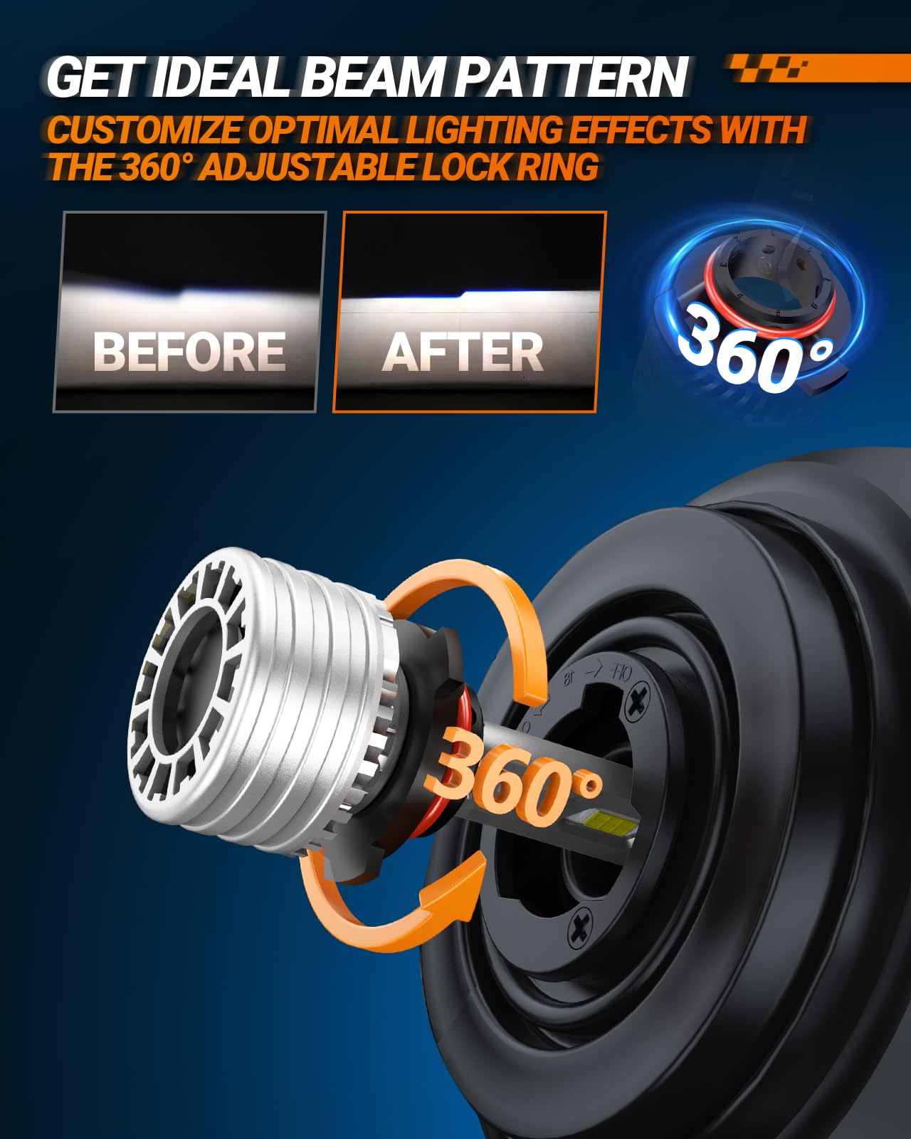 - 1:1 Size Design: The SEALIGHT X4I 9005 H11 bulbs feature a 360° adjustable lock ring, ensuring focused light distribution. This design maximizes visibility by illuminating road signs on the passenger side while minimizing glare for oncoming drivers.