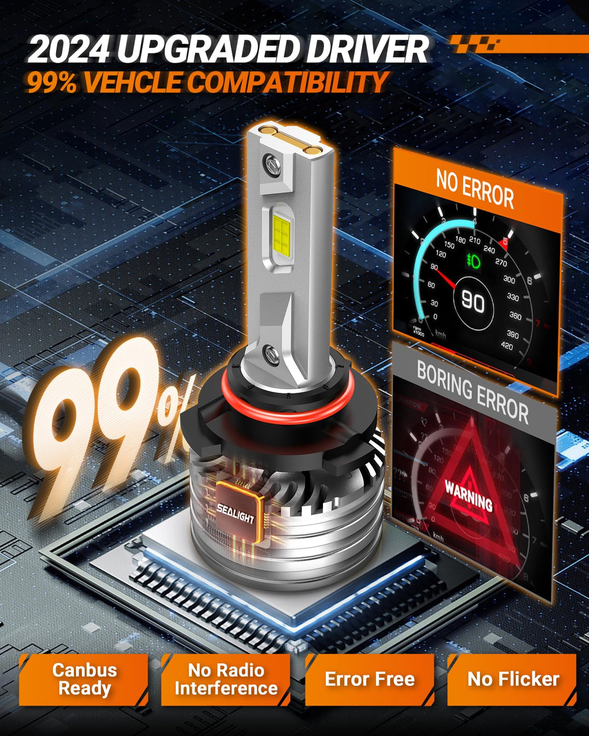- Wide Vehicle Compatibility: The SEALIGHT X4I 9005 H11 combo lights are designed to be compatible with 99% of vehicles. Built-in upgraded drivers eliminate error warnings and flickering, ensuring a seamless upgrade for your automotive lighting system.