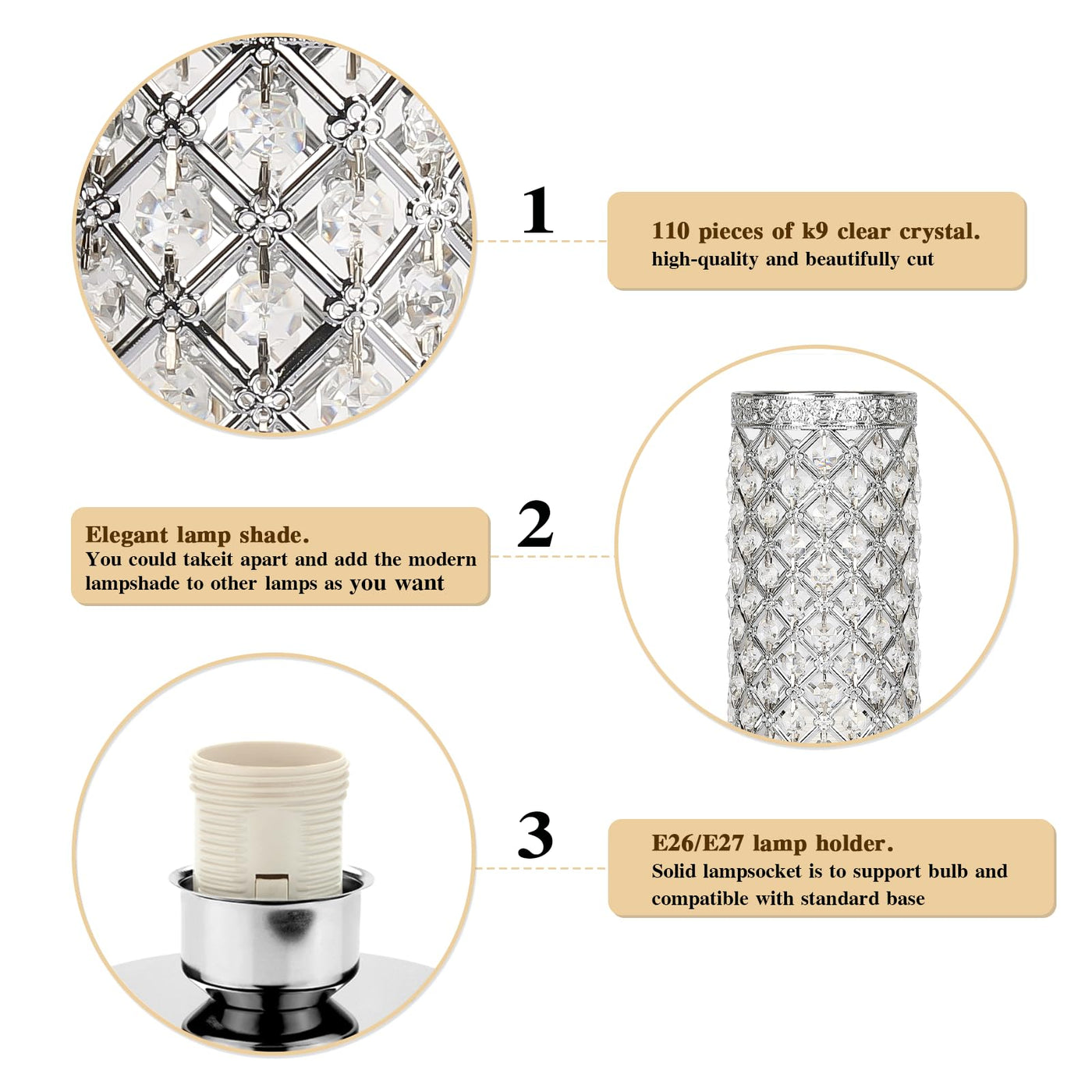 - **Premium Crystal Design**: Crafted with 110 pieces of meticulously cut K9 crystals, this lamp creates a breathtaking visual effect, sparkling beautifully when lit. Each crystal is hand-strung to ensure they stay securely in place, resembling a luxurious crystal blanket.