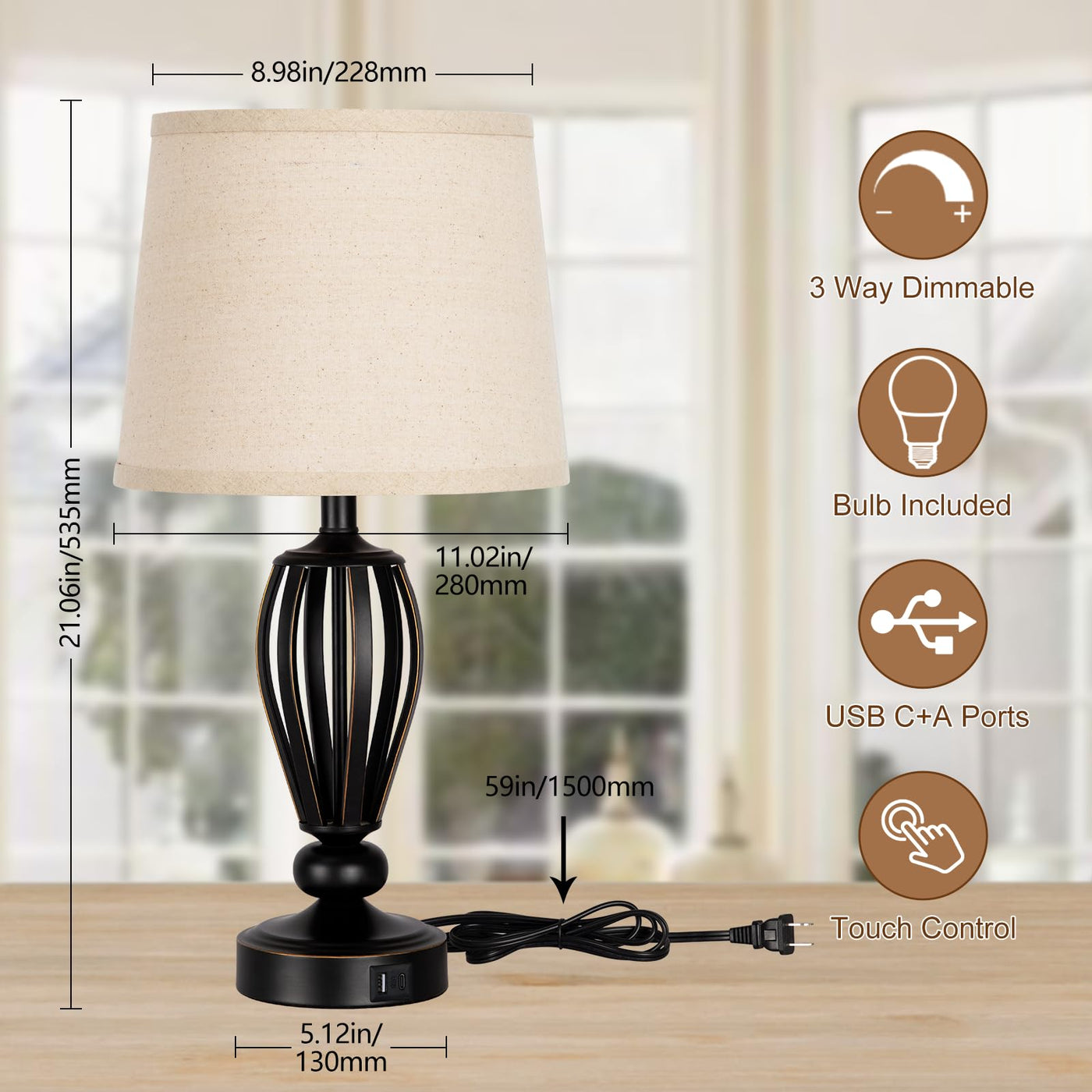 Seaside Village Usb Bedside Lamp - 3-Way Dimmable, Touch Control, Black Metal Base, Led Included