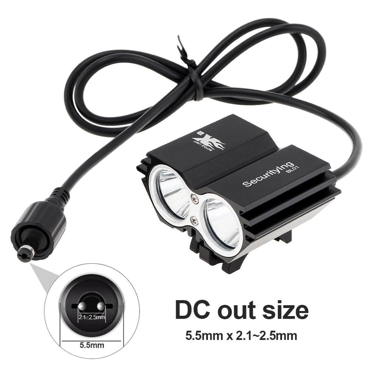 Bicycle Light: - Color: Black - Light Color: Cool White - Shell Material: Aircraft Aluminum with Military Type III Hard-Anodized - Lens Type: Glass Lens - Reflector Type: Aluminum Textured - Switch Placement: Back of the bicycle light - Switch Type: Clicky - 4 Switch Modes: Weak / Middle / Strong / Strobe - Waterproof Rate: IPX-7 - Visible Distance: 200m - Anti-drop Height: 1.5m High-performance Electronic Switch: - Slightly click the switch to turn ON / OFF the light - Slightly click the switch to change the brightness modes, LOW - MID - HIGH - Long press the switch for more than one second to access to strobe mode Battery Indicator (beside the blue button): - Three lights lit on (power more than 80 %) - Two lights lit on (power between 50 % and 80 %) - One light will lit on and will flash three (runtime less than 30minutes) LED: - Quantity: 2 - Luminous Flux: 700lm - Lifespan: 50,000 hours - Lighting Source: LED - Light Source Color: 6500K - Lighting Intensity: 3000cd Power & Battery Pack: - SecurityIng 1 x 8.4V 4000mAh Battery Pack (Included) - Output: DC 8.4V, 2.4A - Charger Input: 100V-240V, 50/60Hz - Charging time: 4.5 hours - Runtime: Up to 2.5 hours (high mode) - LED Indication for: Power On / Charging / Full charge - Working Time: 3 ~ 4 hours after full charging Size: 42mm (Length) x 60mm (Width) x 38mm (Height) /1.65 x 2.36 x 1.50in Product Weight : 96 G / 3.39 Ounces