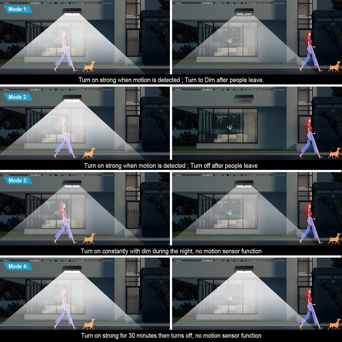Q: What are the different working modes available for these solar lights?A: These solar lights feature four working modes: Dim & Bright Mode, Off & Bright Mode, Constant Lighting Mode, and Emergency Mode, allowing you to choose the best setting for your needs.