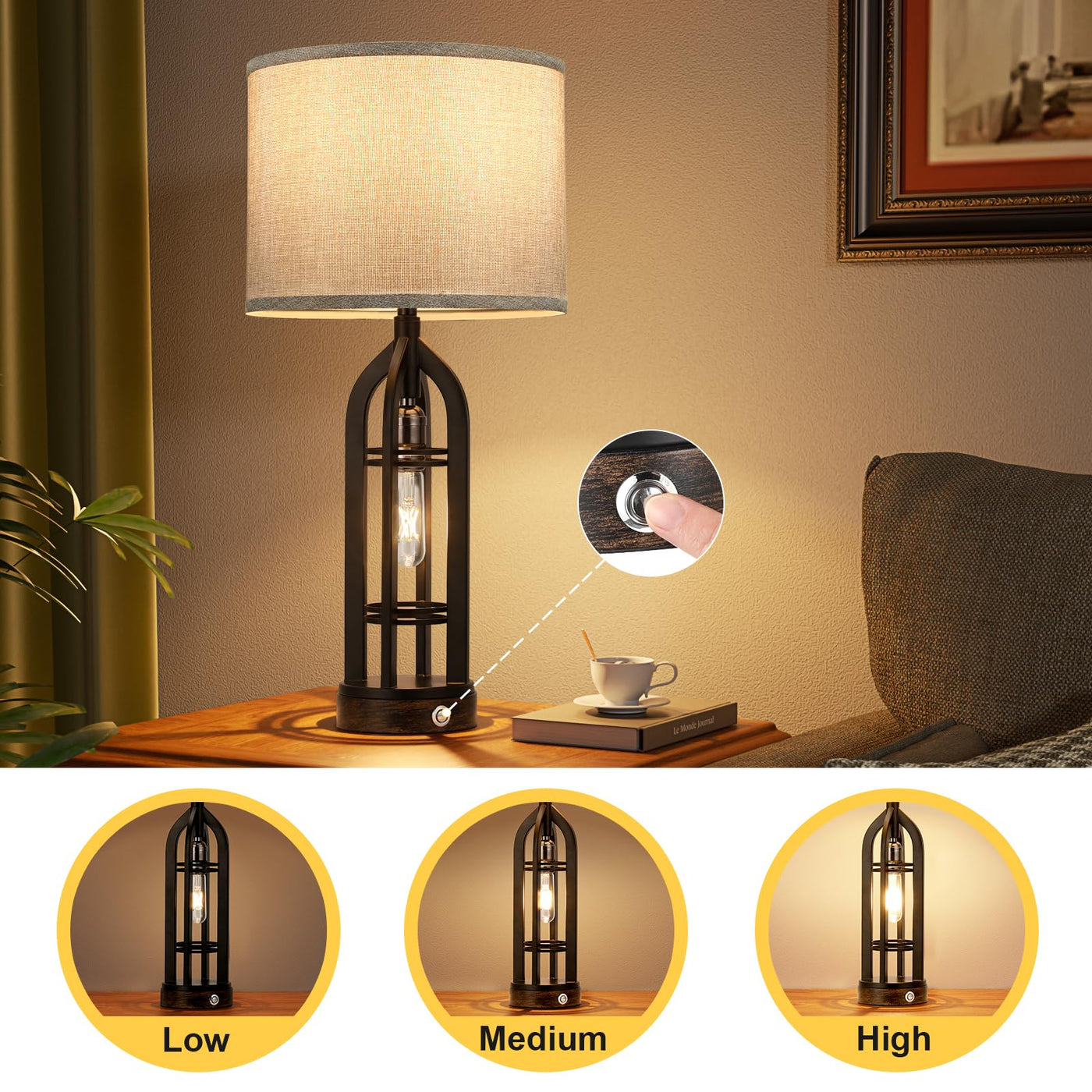 Q: What are the unique features of the Seealle Table Lamp?A: The Seealle Table Lamp features a farmhouse design with a vintage decor style, upgraded USB C+A ports for convenient charging, a 3-way dimmable touch control for customizable lighting, and includes four E26 LED bulbs for immediate use.
