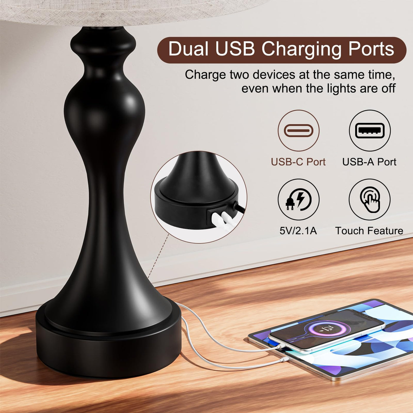 Q: Can I charge my devices while the lamps are off?A: Yes, the dual USB charging ports on the lamps allow you to charge two devices simultaneously, even when the lamps are turned off. This makes them perfect for charging phones, tablets, and other devices without needing an additional outlet.