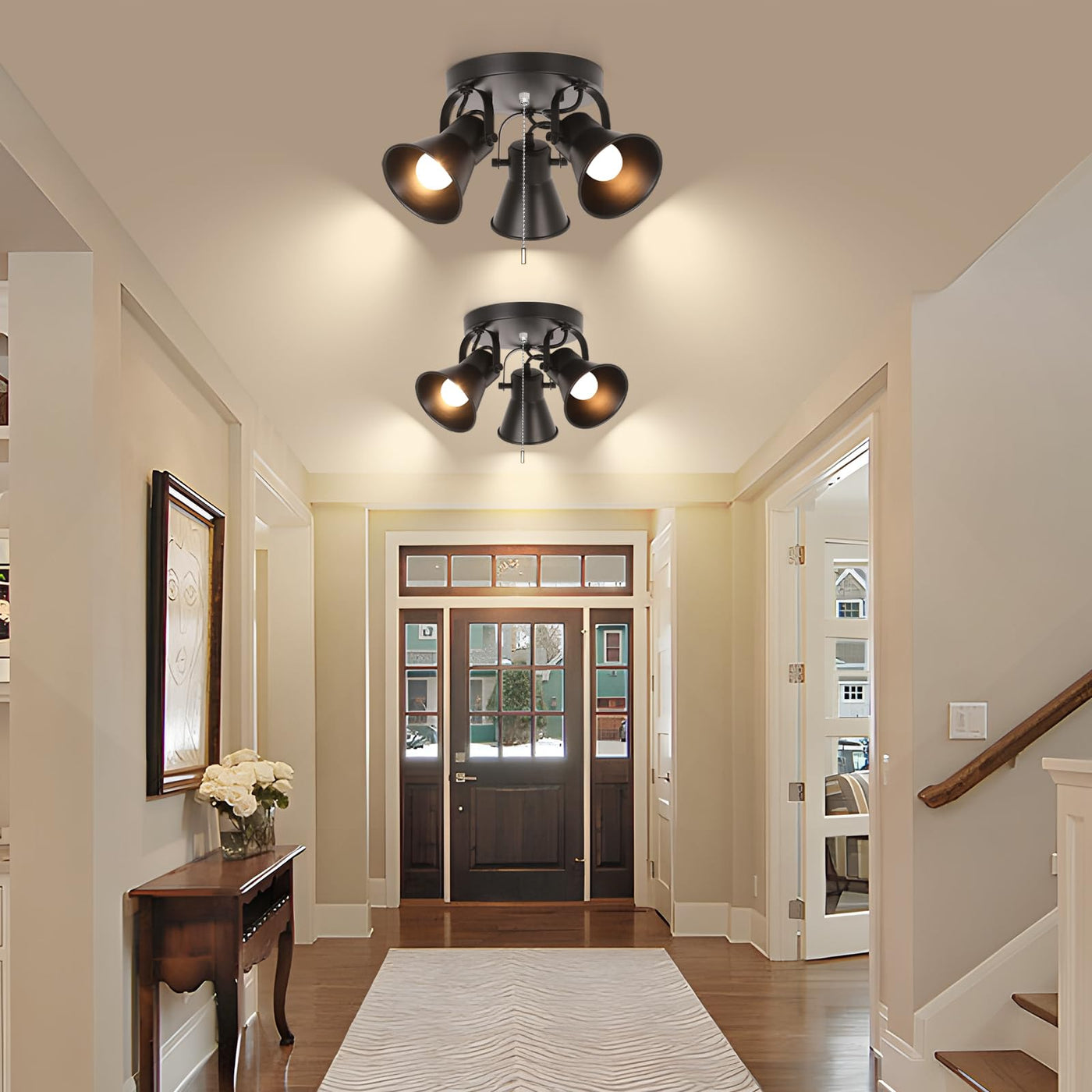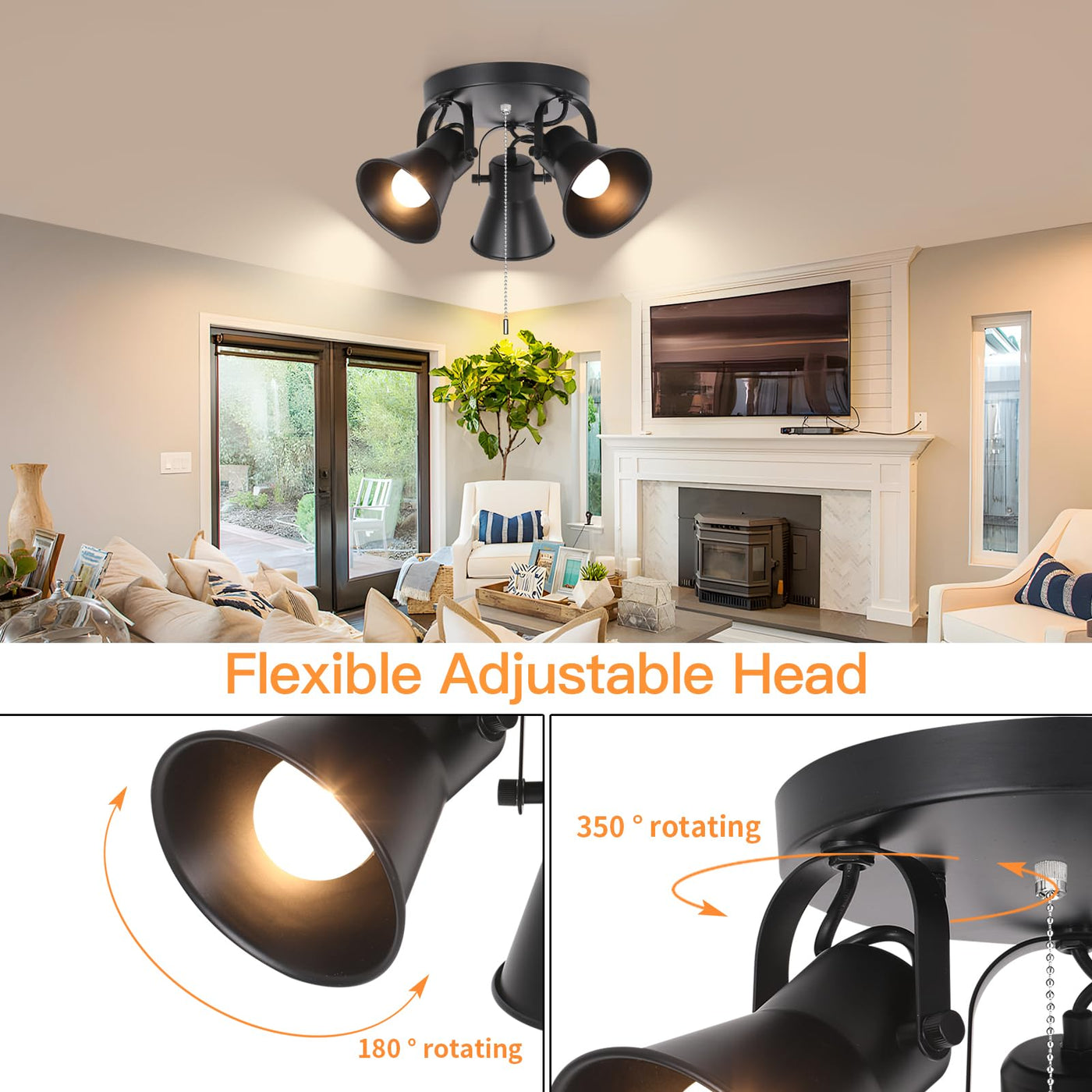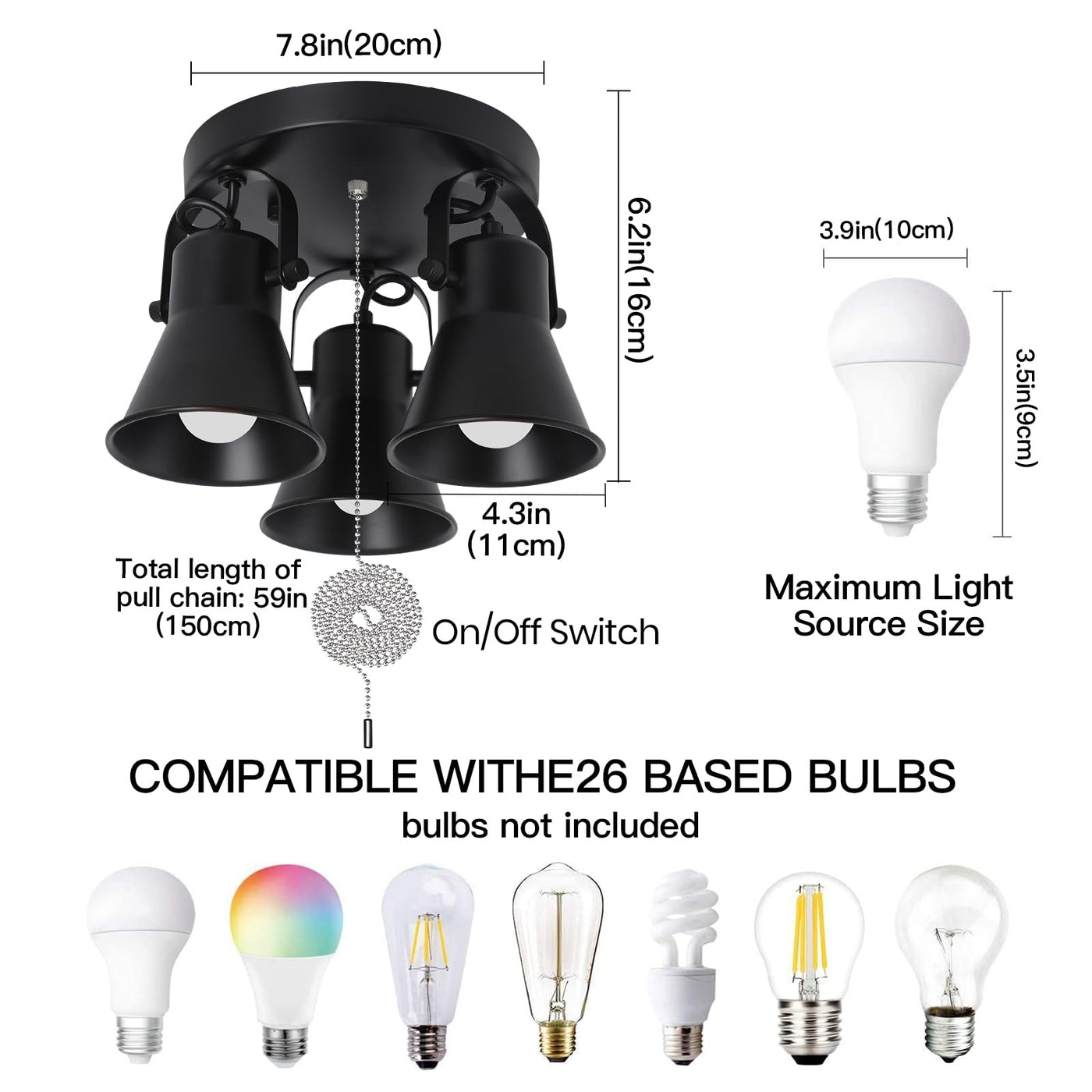 Pull Chain On/Off Switch Ceiling Light:This ceiling light is ideal for spaces without a wall switch. With its convenient pull chain on/off switch and adjustable chain length, you get easy control and a sleek design. Ideal for closets, attics, garages, and more. | Multi-Directional Ceiling Light: 3 individual lights are directional and provide great light no matter where the attention is focused because it is easy to aim the light in any direction you need. | Easy to install: Hardwired, we provide all the installation accessories and instructions to help you quickly and successfully install this ceiling track light, (also suitable for sloped or vaulted ceilings) | Industrial Style Design: SEEBLEN kitchen ceiling light is made of dependable metal, strong and durable, with a black finish with an open flared shade to emit enough light in any room. | Bulb Requirements: 3 standard E26 sockets (bulbs not included), LED, incandescent, energy-saving lamps, halogen lamps are recommended; fully dimmable when you use a dimmer switch or dimmer bulbs (dimmer switch not included) | Versatile Lighting: This indoor spotlight can be directed where you need it most, such as kitchens, bathrooms, hallways, foyers, living rooms, and walk-in closets.