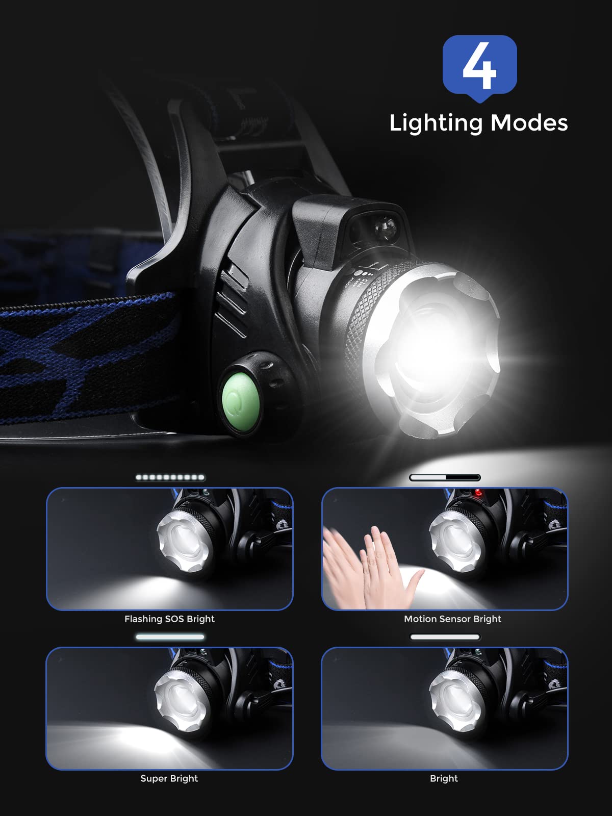 Q: What lighting modes does the headlamp offer?A: The headlamp features 4 lighting modes: super bright, bright, flashing SOS, and motion sensor mode, which allows for flexibility depending on your needs and environment.